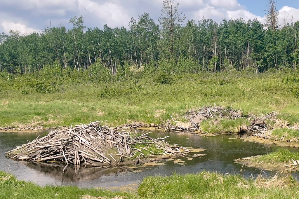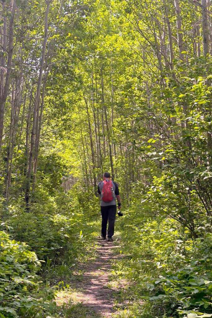 The trail had signs of beaver activity everywhere—freshly chewed stumps, narrow water channels, and muddy slides leading down to the ponds. We stopped for a quiet lunch break beside a massive beaver dam, taking a seat on a boardwalk built by the park to protect the dam, and just listened to the rustle of wind through the trees.