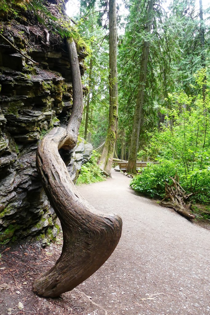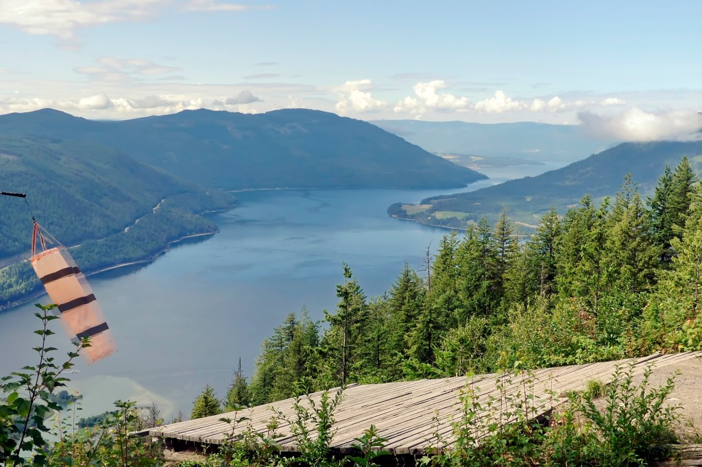While in Sicamous we also took a narrow, twisting, winding and rutted forestry road to a lookout point above the town. Despite some concerns (mainly expletives) about whether our vehicle would make it around all the switchbacks, we eventually came to a break in the trees where a fluttering windsock and a wooden platform reaching out over the cliff edge told us we were there. This was a former jumping-off point for adventurous hang-gliders but it looked like it had seen better days so we kept well back from the edge. The view over the town and lake was definitely worth it, although we still had to cautiously navigate the treacherous return journey back down the hillside!
