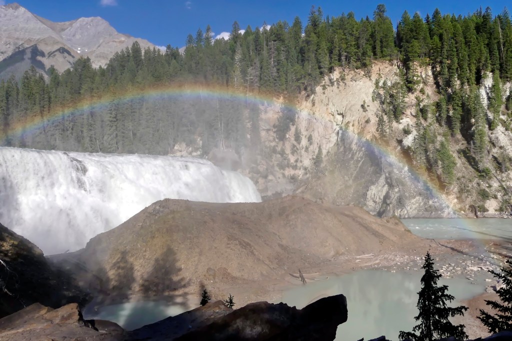 Then, on our way home, we made a point to stop at Wapta Falls in Yoho National Park – and wow, what a way to wrap up the trip. The trail was a bit longer than the others, around 4.5 km round trip along a tree-rooted and muddy path, but completely worth it. As we reached the final lookout, the thunder of water filled the air, and we were met with the massive, wide curtain of water from the Kicking Horse River pouring down into a spray-filled basin below. With the backdrop of the Rockies and the lush forest surrounding it, along with a bright halo of a rainbow appearing from the mist, Wapta Falls was the grand finale to our waterfall adventures – and an unforgettable end to a truly peaceful and scenic trip.