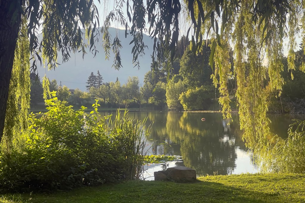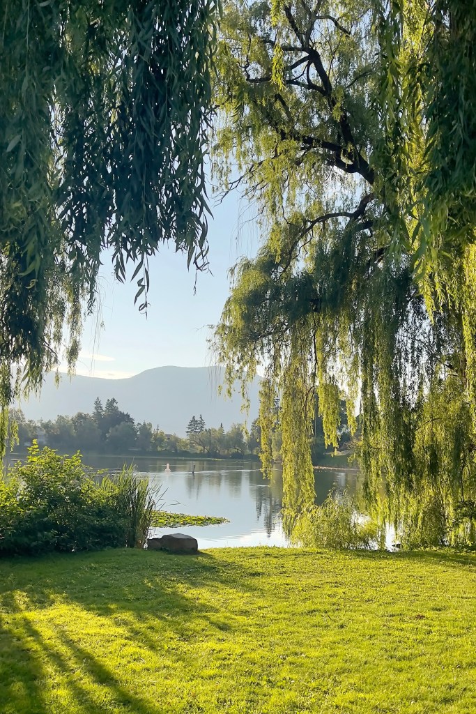 The path circling tranquil McGuire Lake become our regular dog-walking route in the cooler evenings. It was a popular but peaceful nature retreat and looked stunning with sunlight filtering through majestic willows at golden hour .