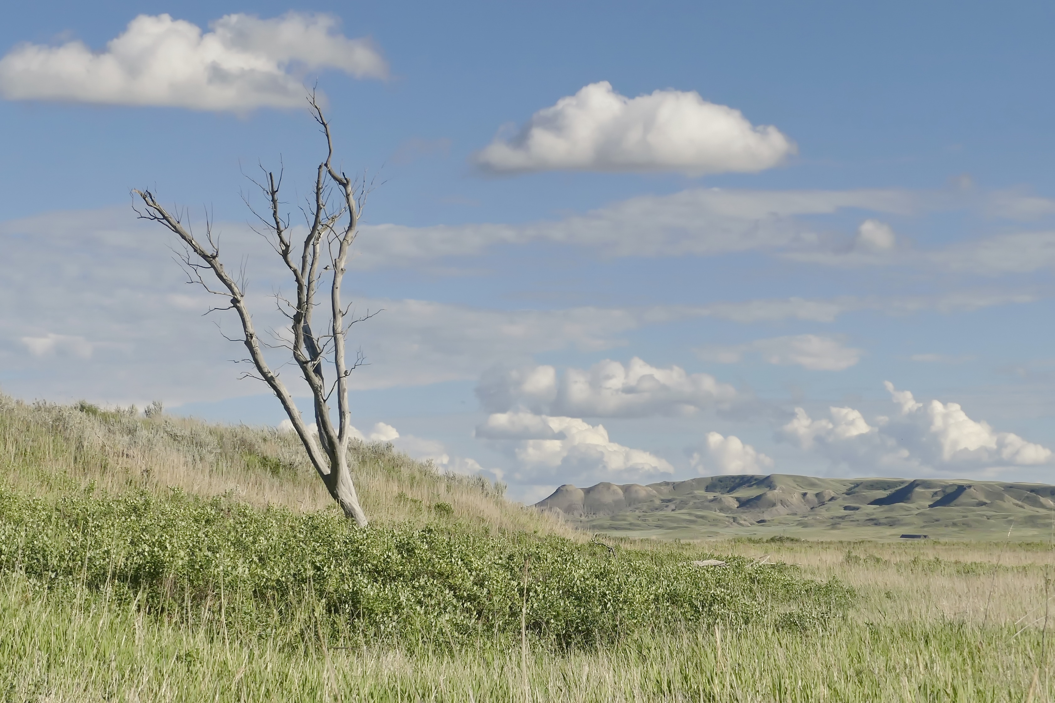 Our final acitvity was the Riverwalk Trail, an easy loop that follows the meandering Frenchman River. It’s a gentler walk compared to the buttes, but it lets you experience the park at a slower pace, noticing the wildflowers, birds, and subtle changes in the terrain along the water’s edge. The billowing grasses shimmered like silk in the wind, and the towering, sandy banks of the river dwarfed the current flow. The bleached trunk of a lone tree stood stark against the horizon and from it’s branches we were dive-bombed a few times by a territorial Eastern Kingbird as we passed by.