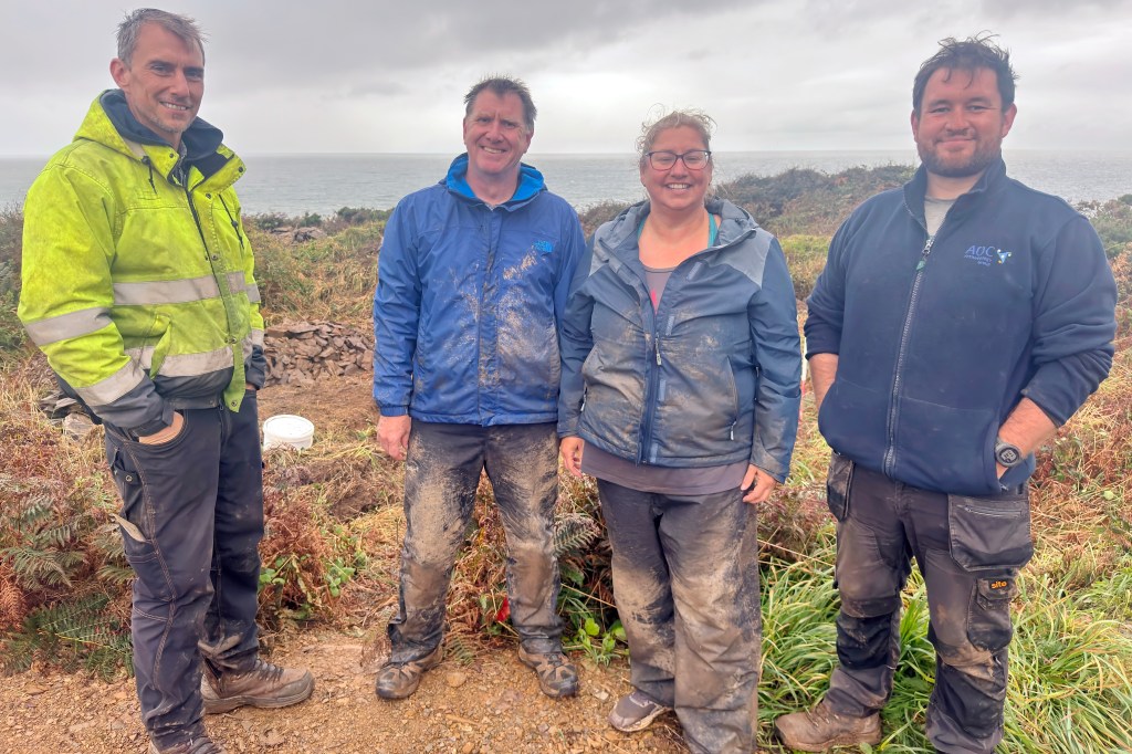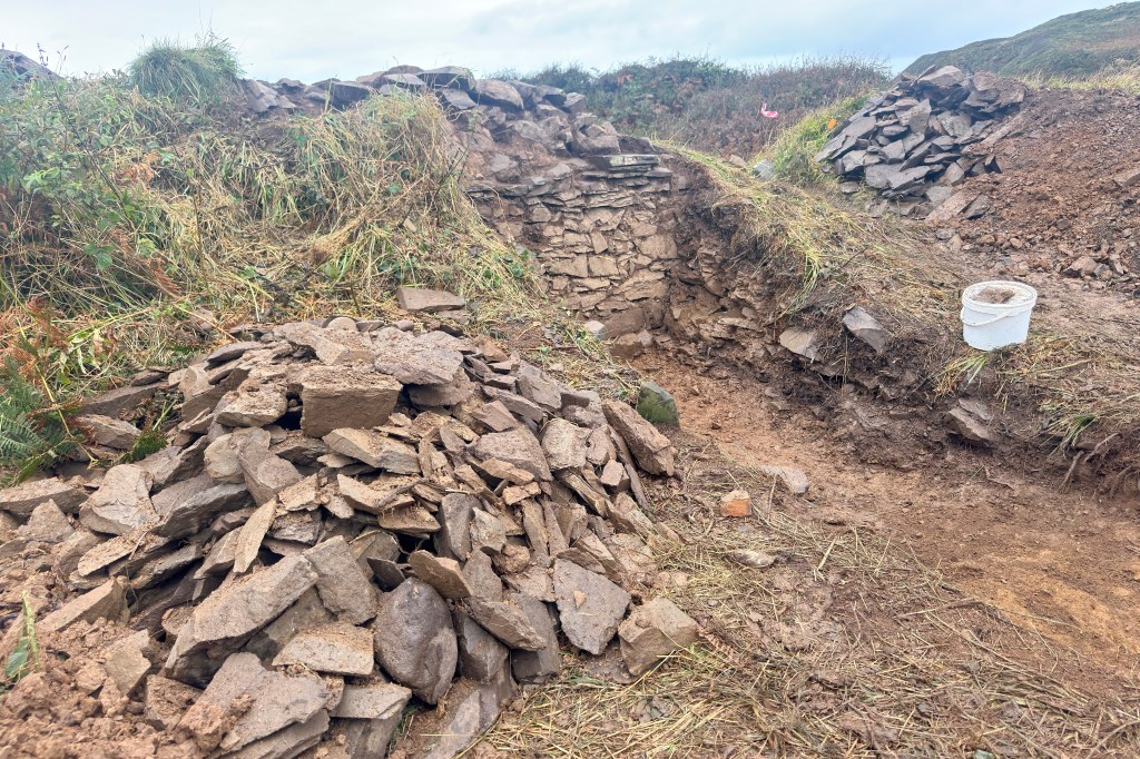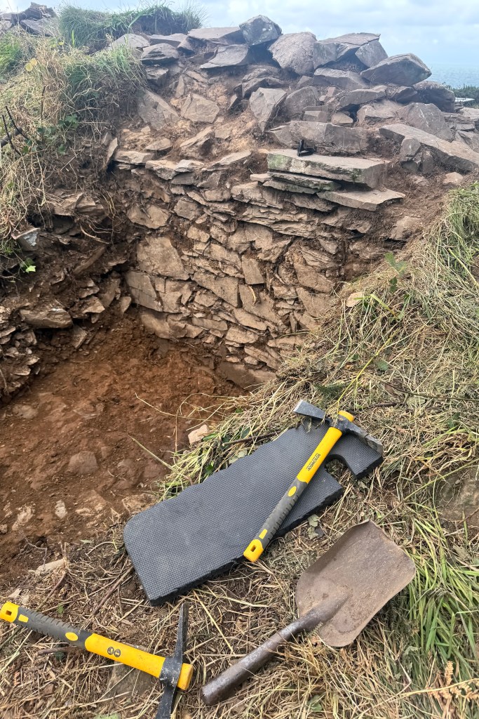The site is located on a rocky promontory near St. Ninian’s Cave overlooking the Irish Sea on the Solway Coast in the south of Scotland. The remains of the fort are bounded by ruinous low walls following the edge of the promontory, and the defensive position is strengthened by a further wall on the north, providing additional protection from land approaches. The area is now overgrown with mounds of grass and other vegetation, which have accumulated over the years. The aim of the dig was to open three trenches to try and determine the scale and interconnections of the fort walls and to see if there was evidence of multiple uses over time.