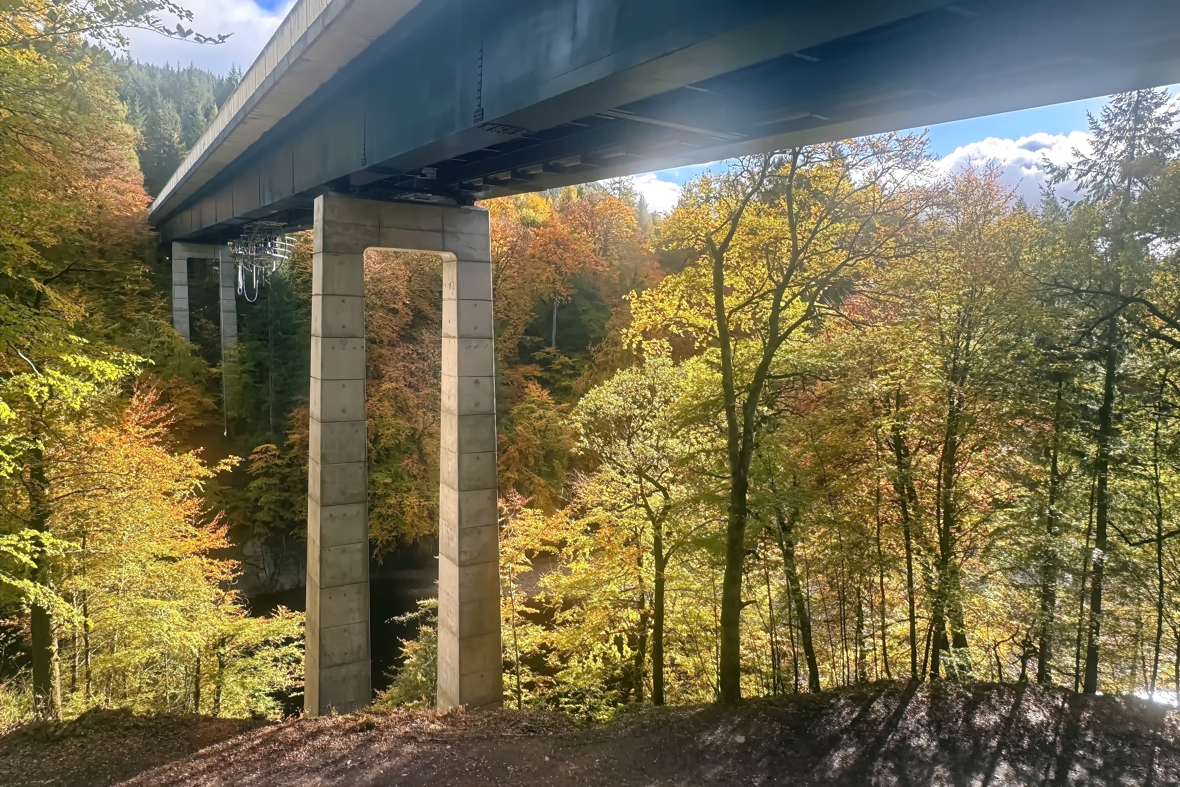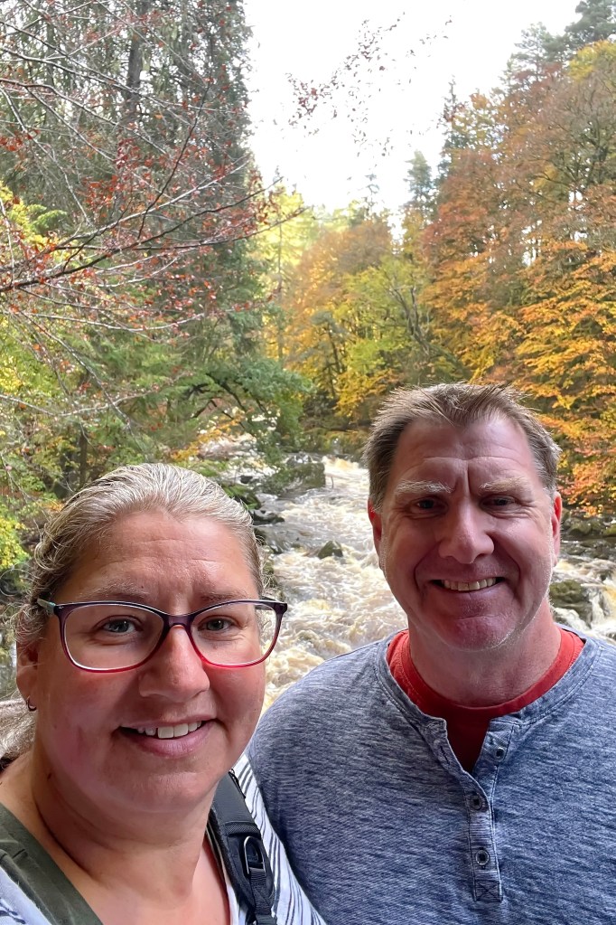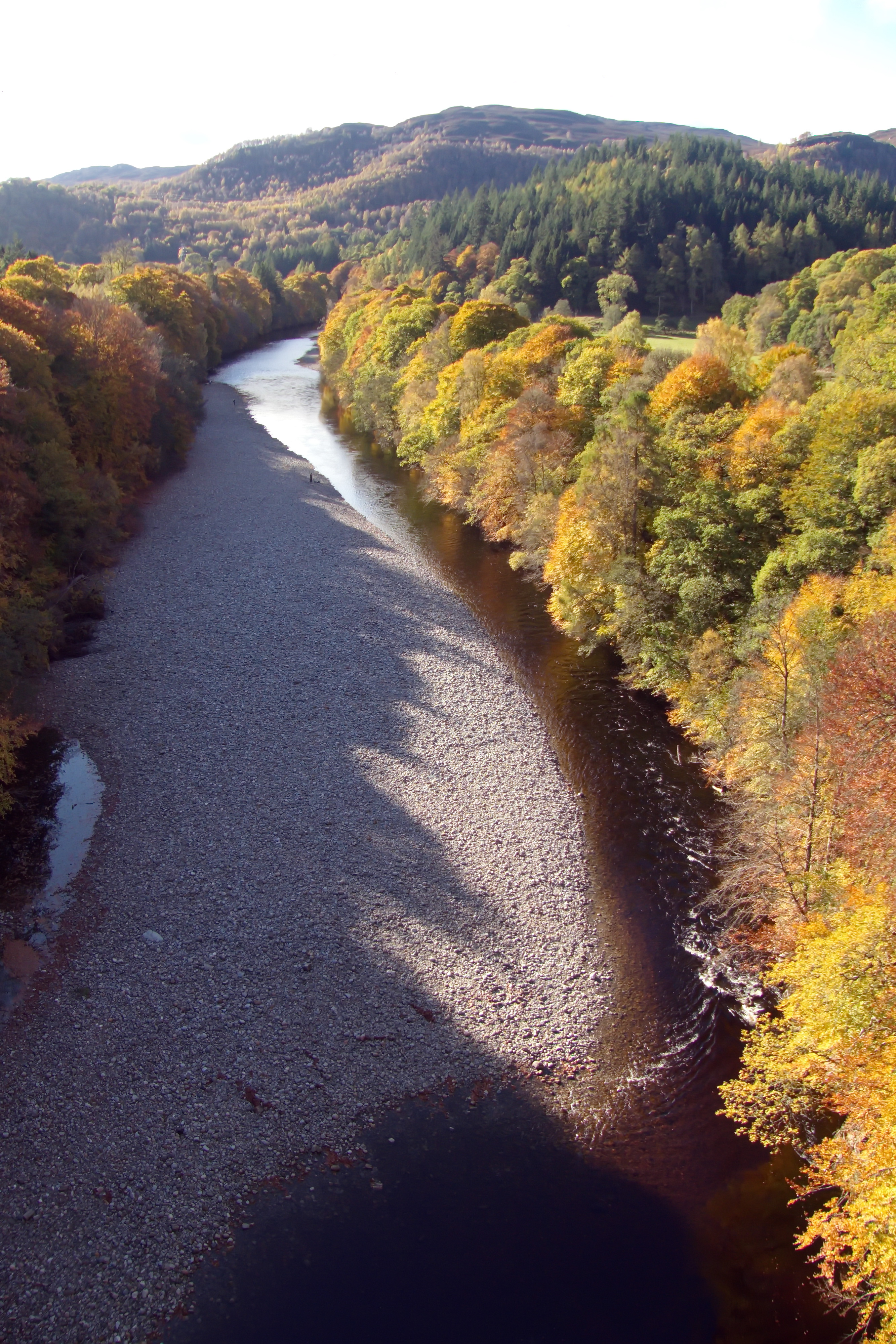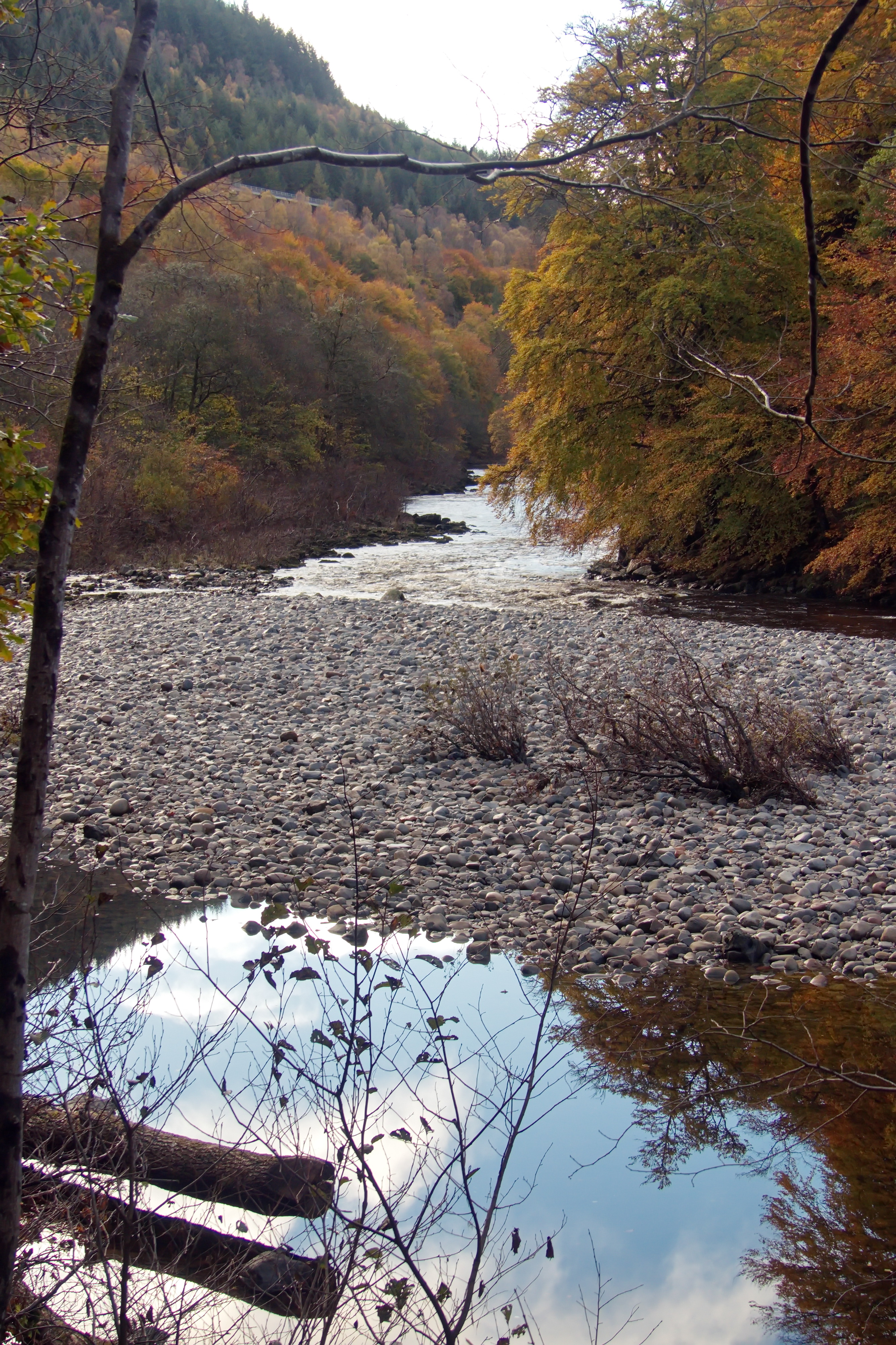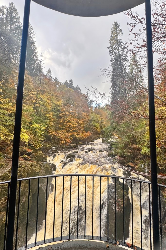 The trail continues toward the Linn of Tummel, leading you past several dramatic viewpoints, especially from Garry Bridge, the perfect finale to our walk. The contrasts there were striking: to the north, the gorge wrapped in colour with the cone-shaped peak of Ben Vrackie rising above; to the south, the river calmed into a peaceful tableau where a lone fisherman stood waist-deep. And then, just to keep things interesting, adrenaline junkies were bungee jumping from a pod slung beneath the bridge—definitely braver souls than us!