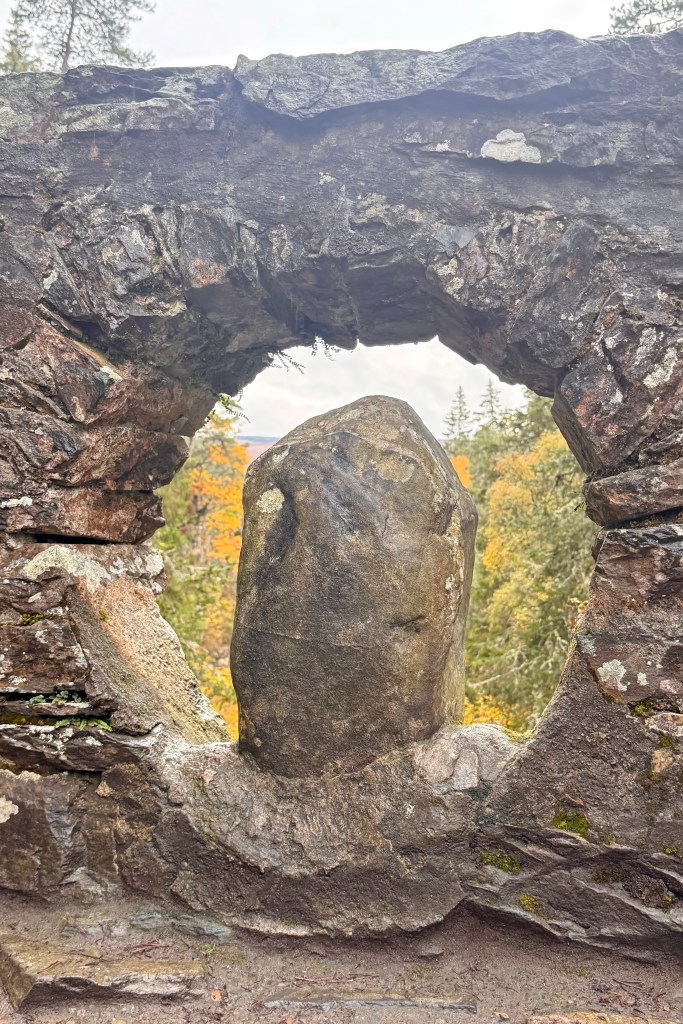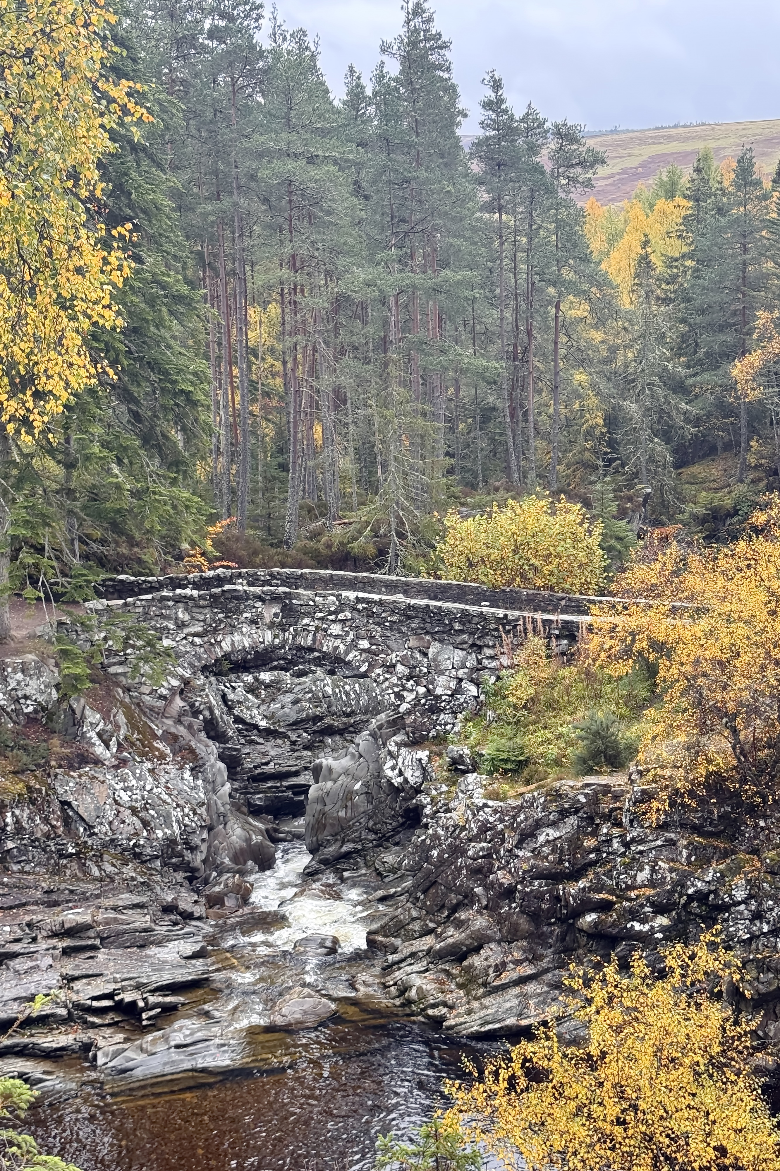 At the highest point of the trail, the upper bridge hides a delightfully quirky feature. Its stone wall is punctuated by openings, each cradling a single, perfectly centered stone. We weren’t sure of the purpose—perhaps purely decorative—but the effect was charming. We paused here, letting the scenery wash over us. The symphony of rushing water, whispering leaves, and the crisp Highland air wrapped around us like a natural embrace, and for a moment, there was no hurry to move on.