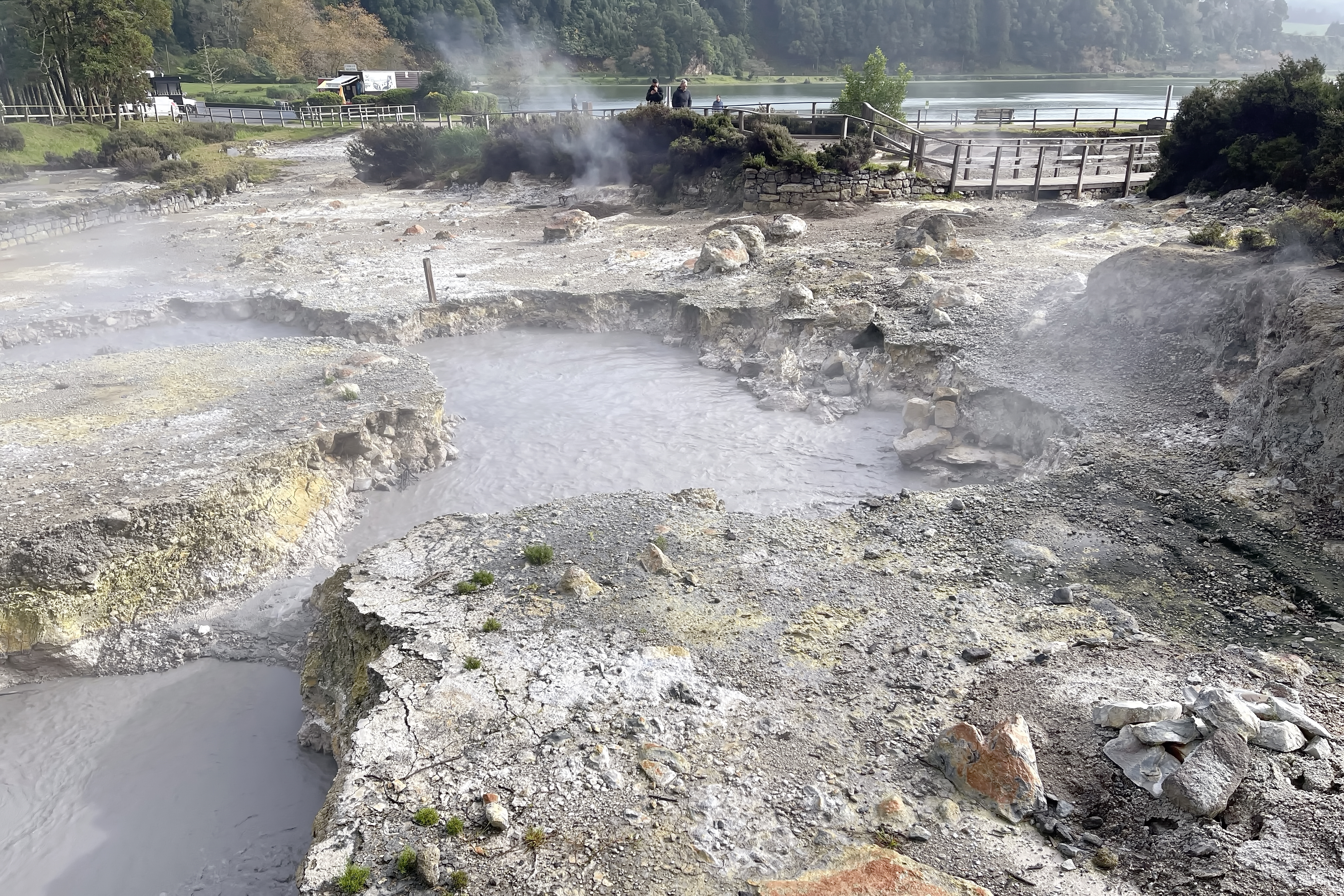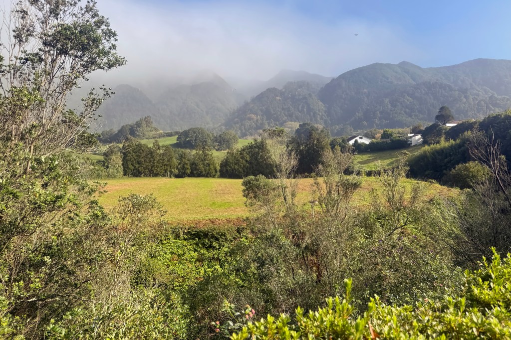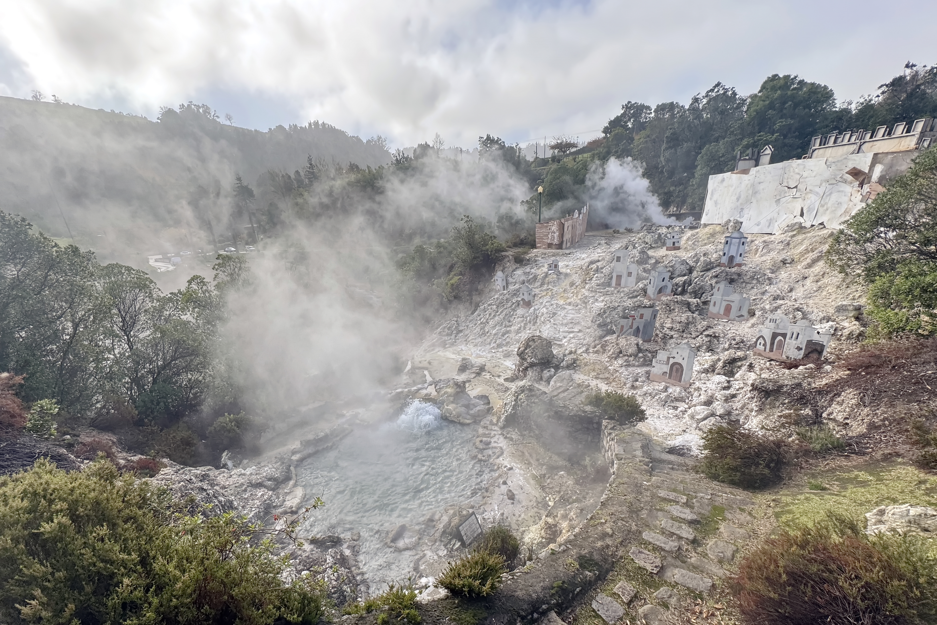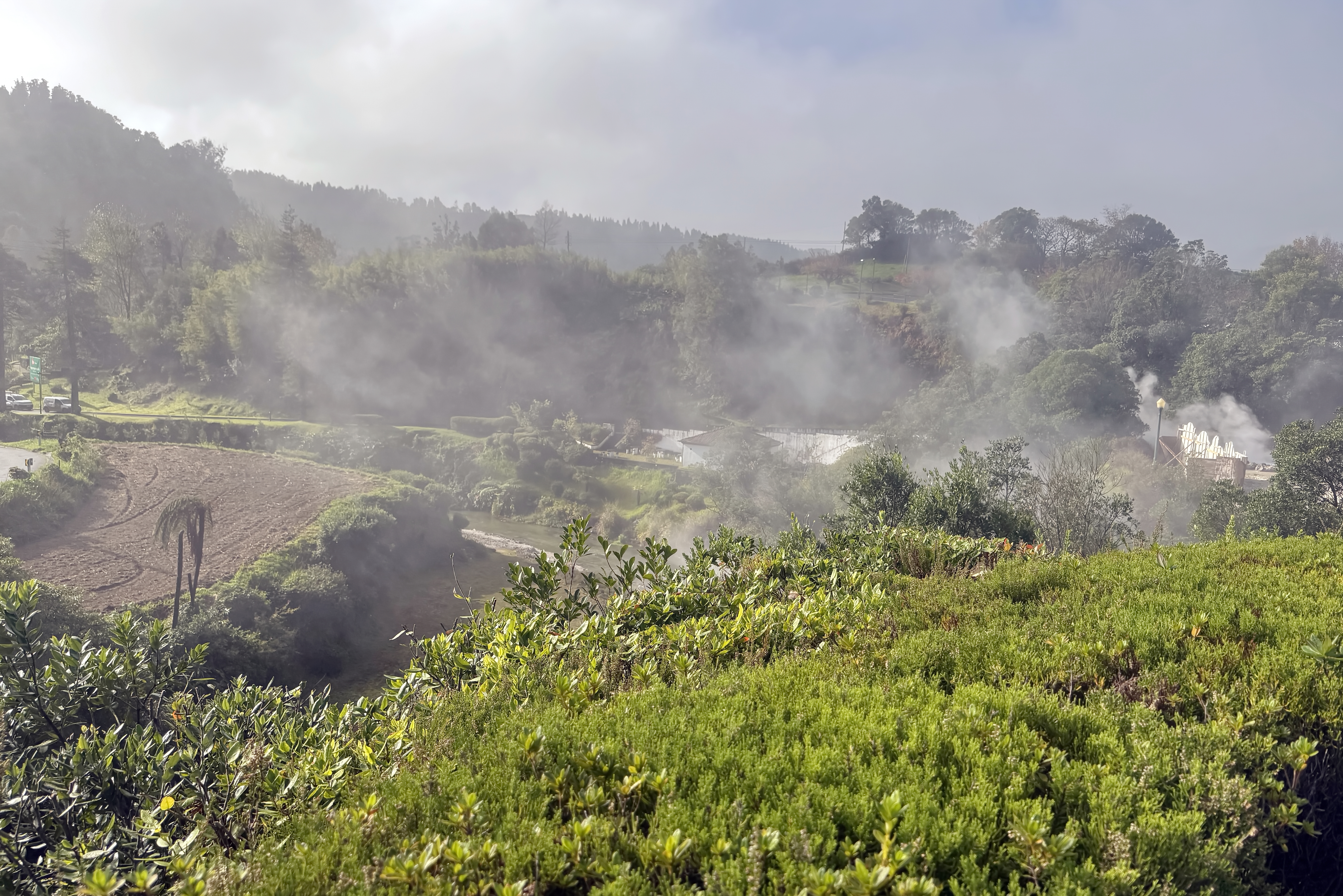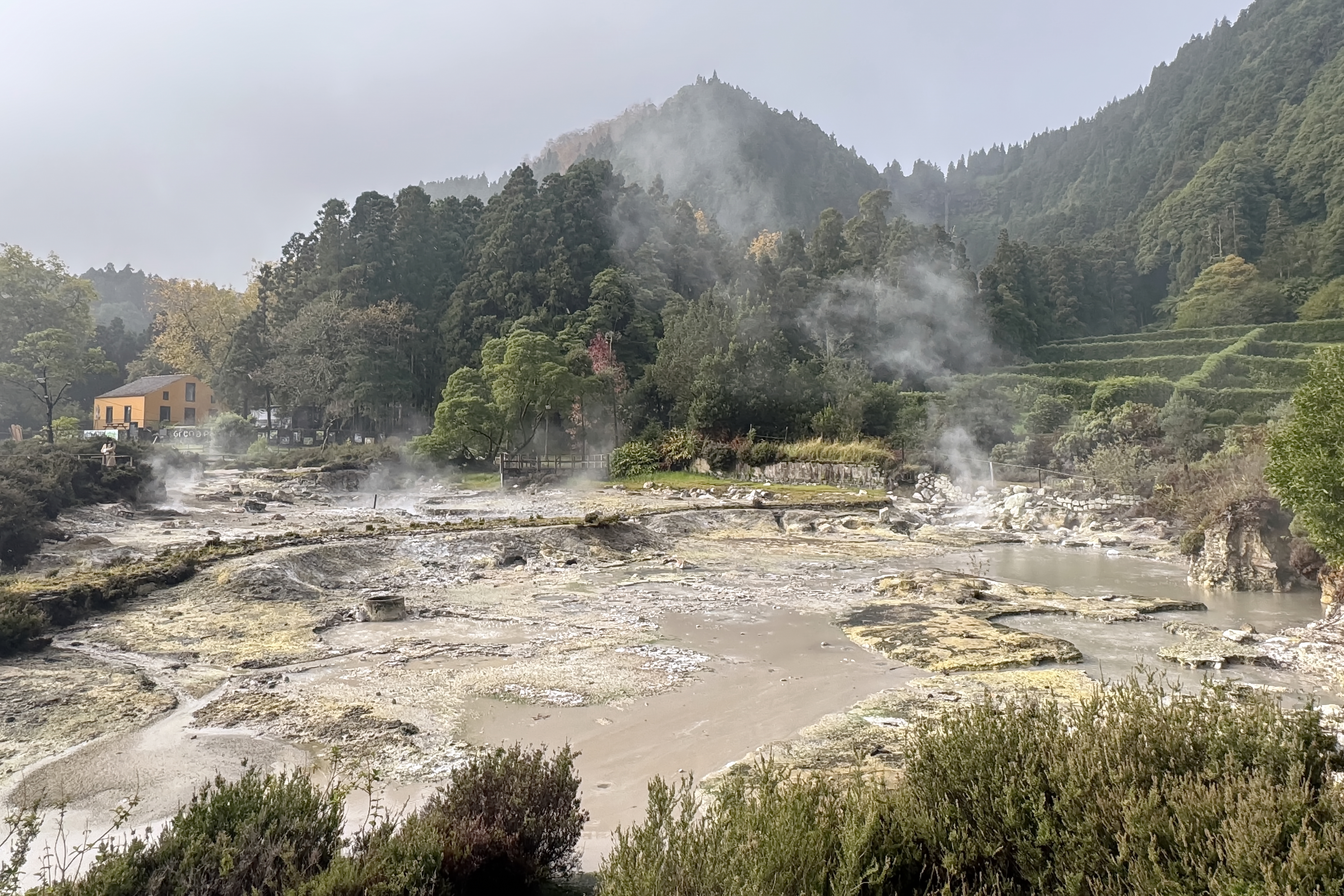 In the village of Furnas, a misty haze drifted up from the sulphurous, mineral-rich waters of the stream as we wandered along the path on its slopes. The trail wound through a tranquil, emerald-green garden, a peaceful setting that contrasted sharply with the gurgling mud pots, steaming fumaroles, and bubbling hot springs nearby. The air carried the unmistakable scent of sulphur, the ground hummed with quiet energy, and it felt impossible not to be completely absorbed. Furnas is a place that engages all your senses and leaves you feeling quietly enchanted.