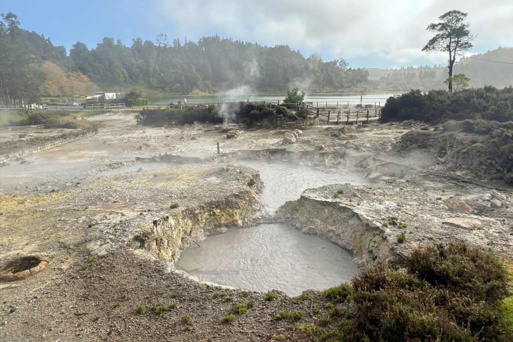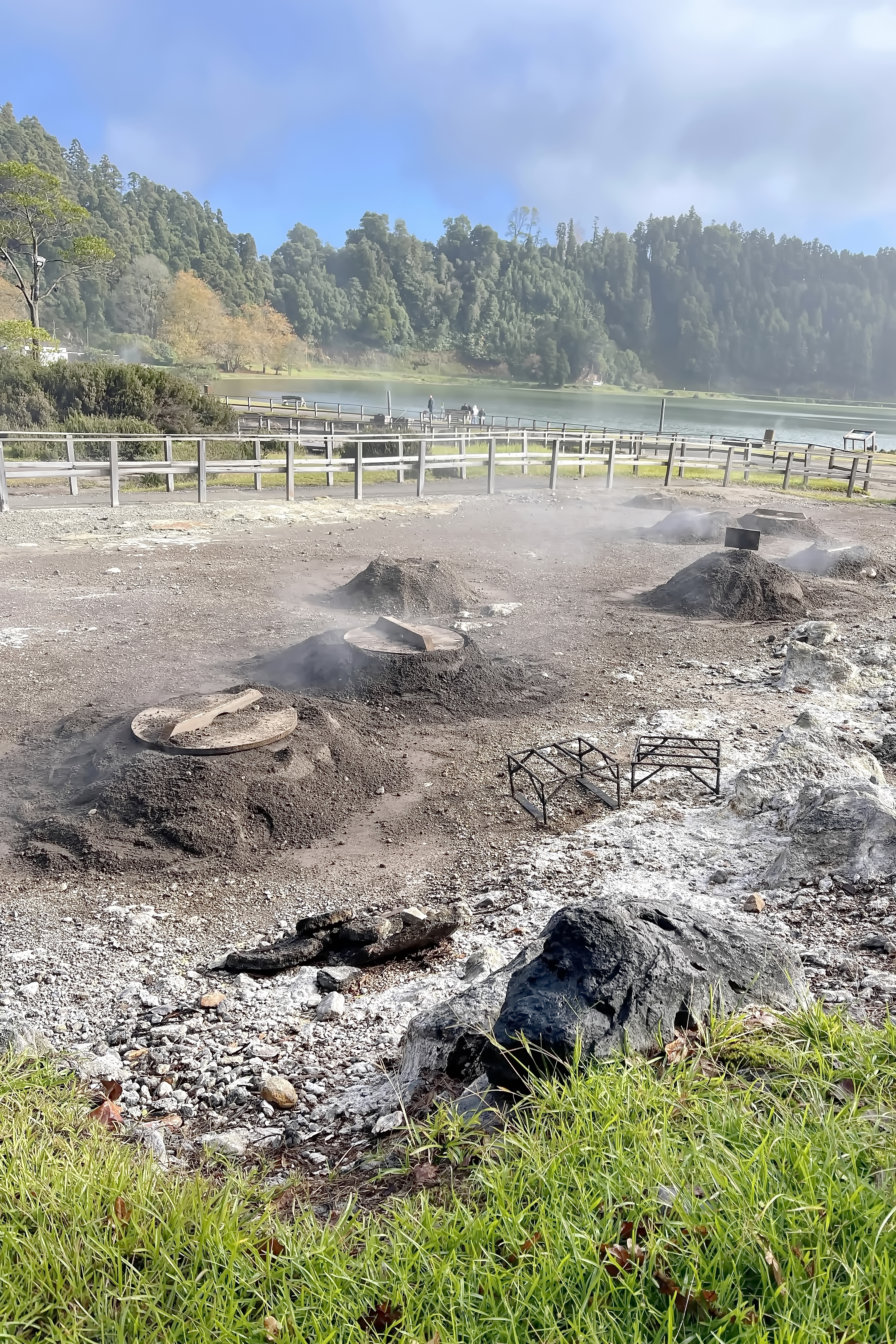 A short drive away, Lagoa das Furnas revealed a very different mood. The still surface of the crater lake reflected the surrounding volcanic ridges beneath ever-shifting light, creating a scene that felt calm and contemplative. Boardwalks led us safely past steaming vents and warm mud pots, where the water hissed and bubbled with the earth’s heat. This is also where one of Furnas’ most beloved traditions comes to life—the famous ‘cozido das Furnas’, a hearty stew of meat and vegetables slowly cooked underground using volcanic steam. We had to try it, and it sure lived up to expectations—delicious, flavourful, and filling. Having our meal prepared beneath our feet made the experience feel even more connected.