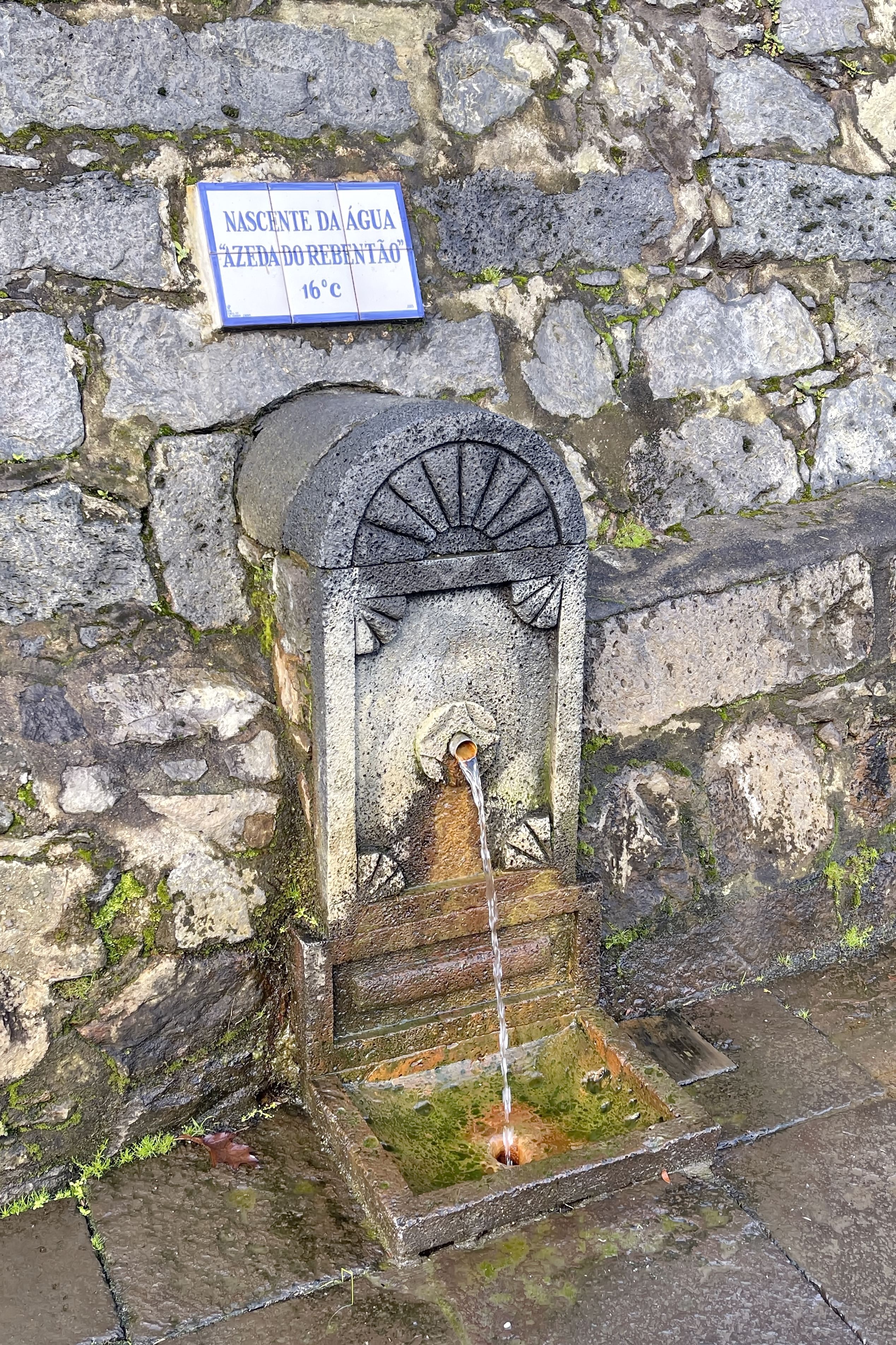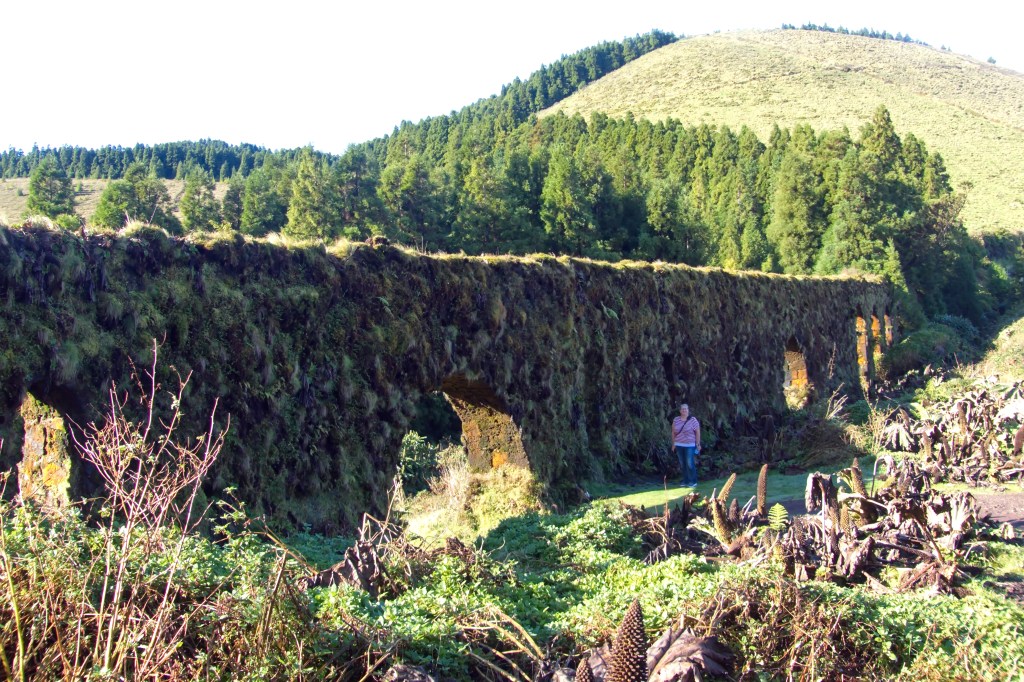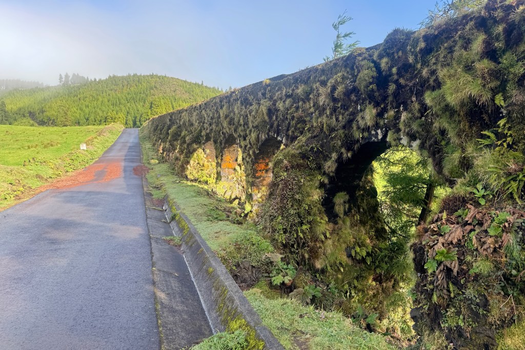 Just nearby, the more popular Aqueduto do Carvao stands with a simple, enduring pride. Looking at it, it was hard not to imagine the effort behind those walls: hands shaping basalt blocks, water slowly finding its route across valleys, generation after generation depending on this quiet ribbon of engineering. The water no longer flows as it once did, yet the structure remains—weathered and dignified, a stone skeleton of everyday life from another era. Even something as practical as a water system feels poetic, softened by moss and time.
