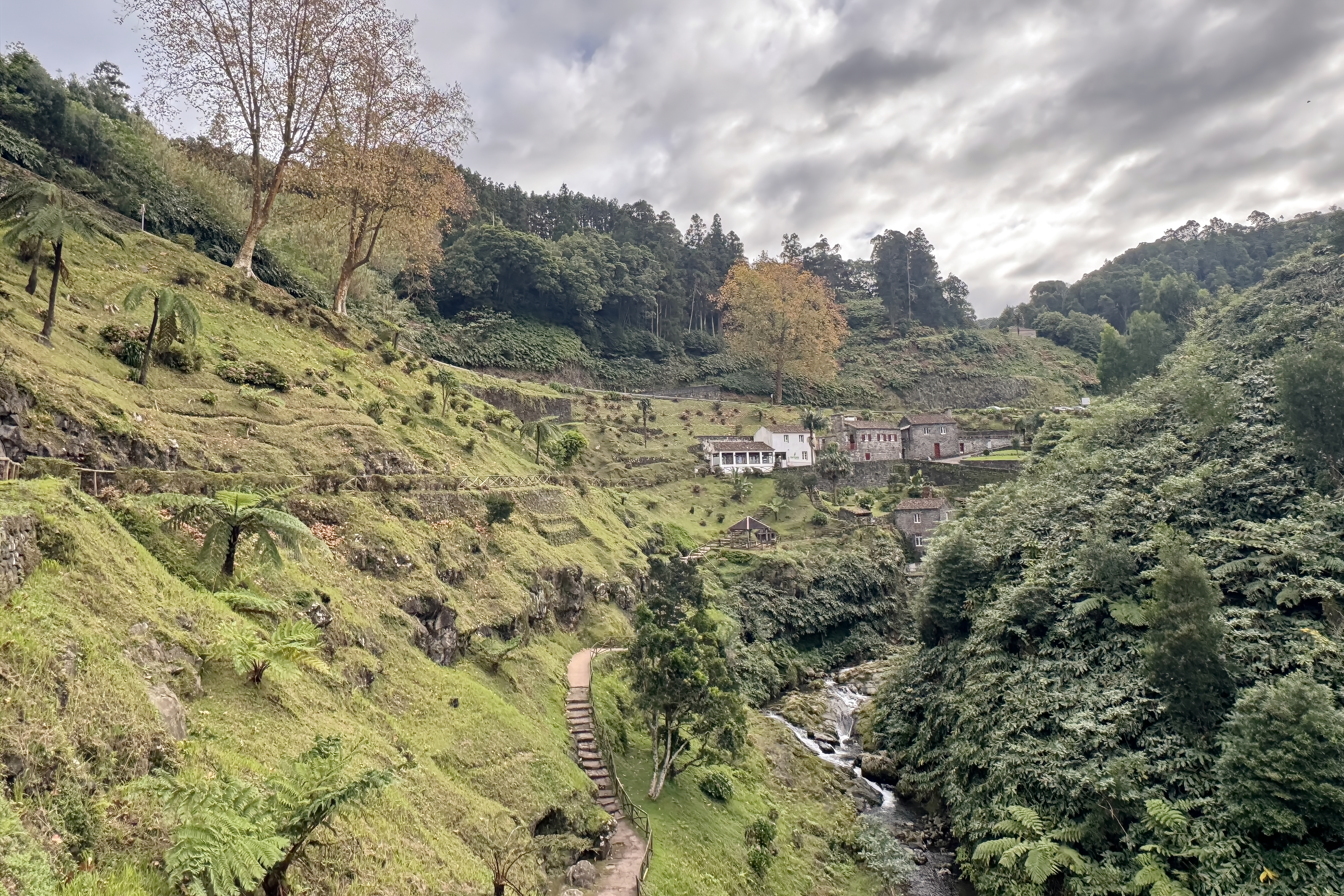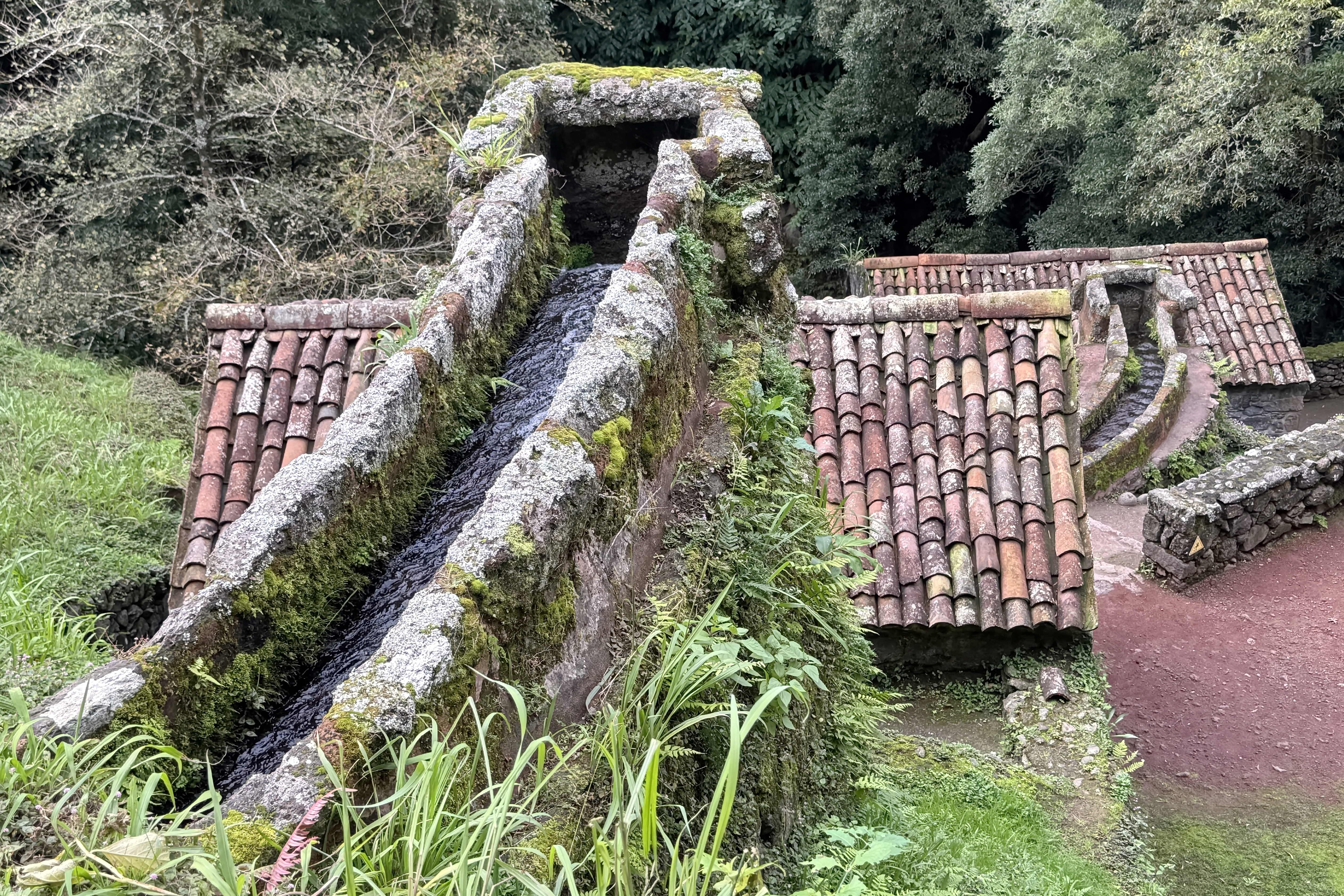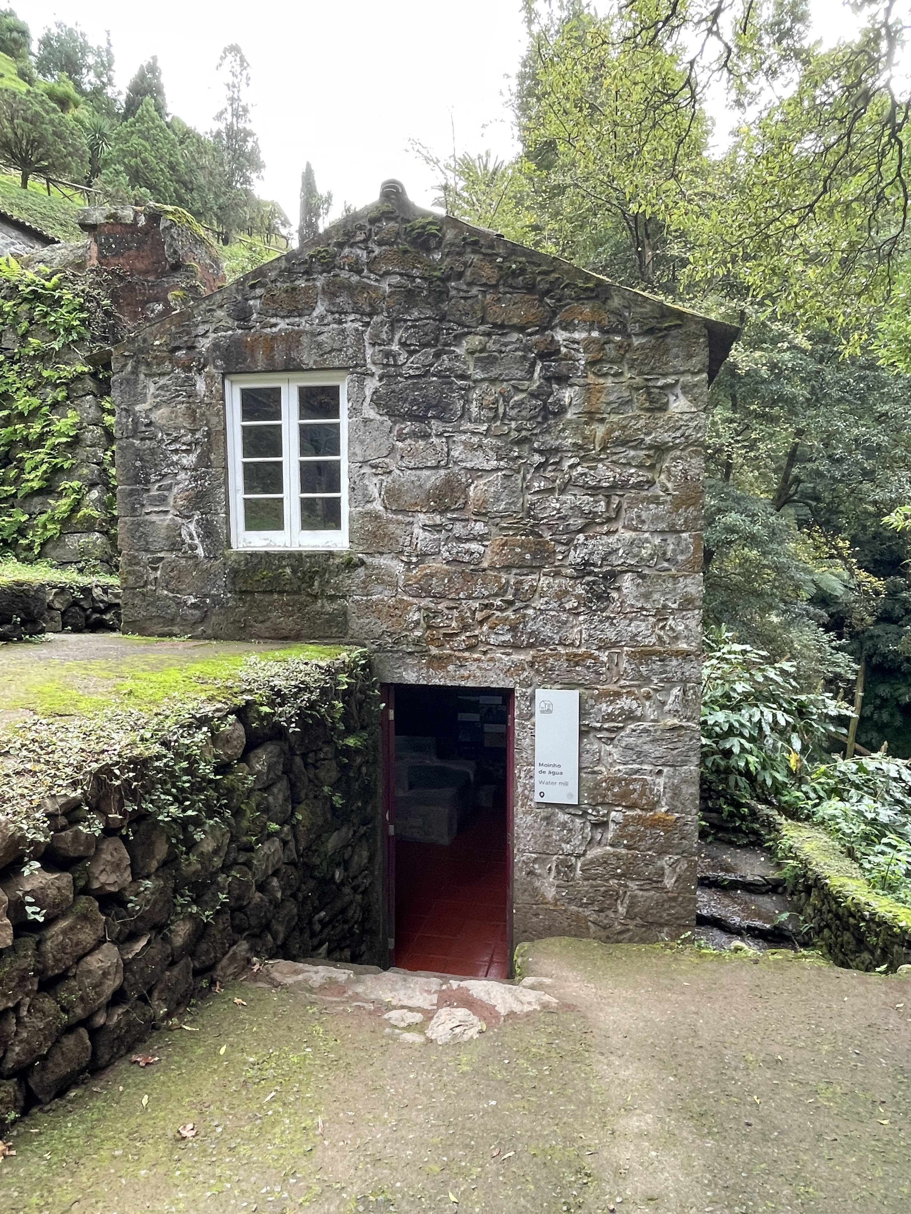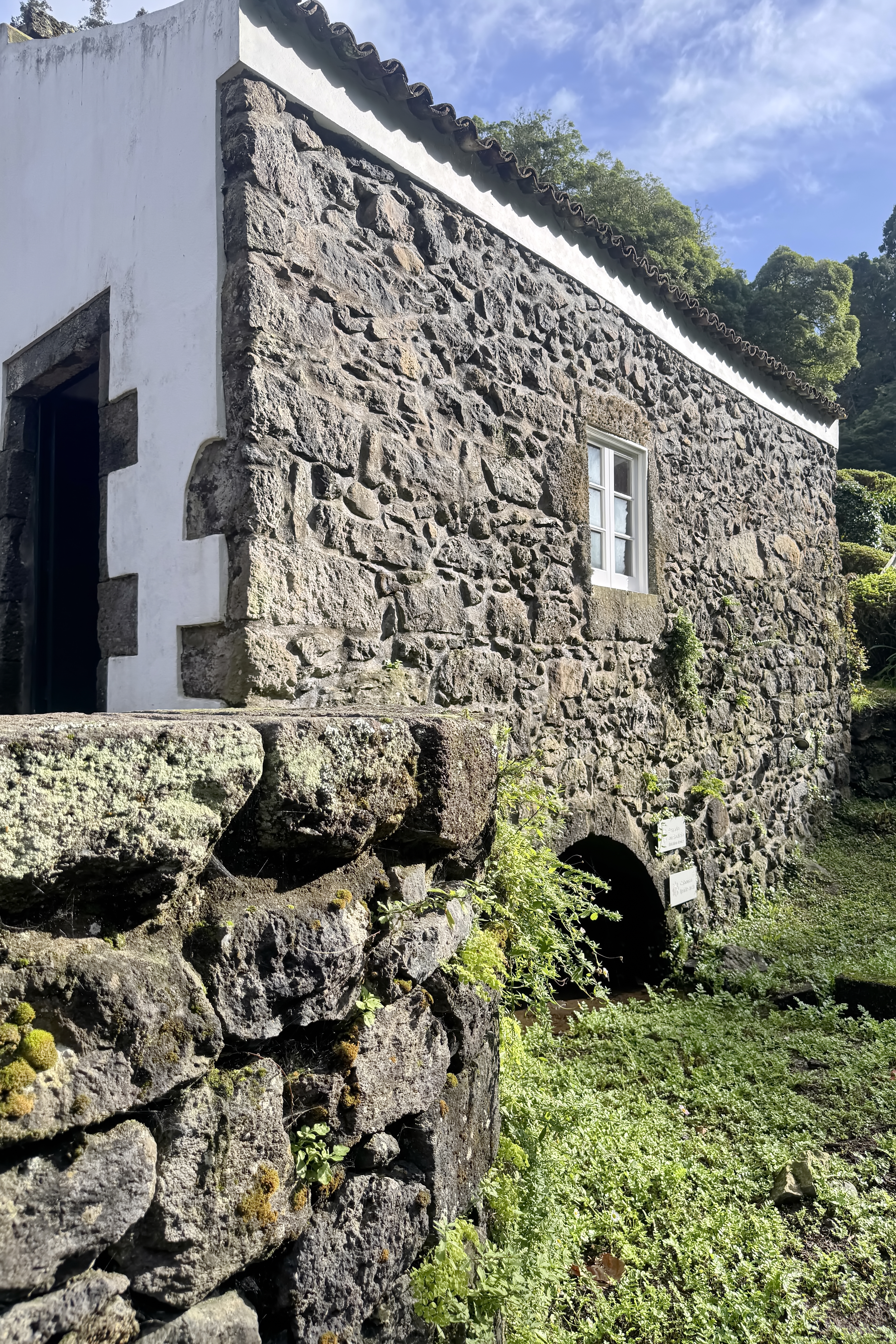 Scattered through the park are five 16th-century watermills, tucked into the hillside as though they had grown from the landscape itself. Seeing them up close, we were reminded that these sturdy stone buildings once powered the island’s grain and flour production and were at the heart of everyday life on Sao Miguel. Traces of that history are still everywhere—in the narrow channels that guided water from mill to mill, and in the grey and whitewashed walls, softened and rounded by centuries of weather. As we wandered between them, it was easy to picture the rhythm of another era—the steady clatter of machinery, voices drifting along the river, and the simple, dependable routines of a community shaped by this flowing water.