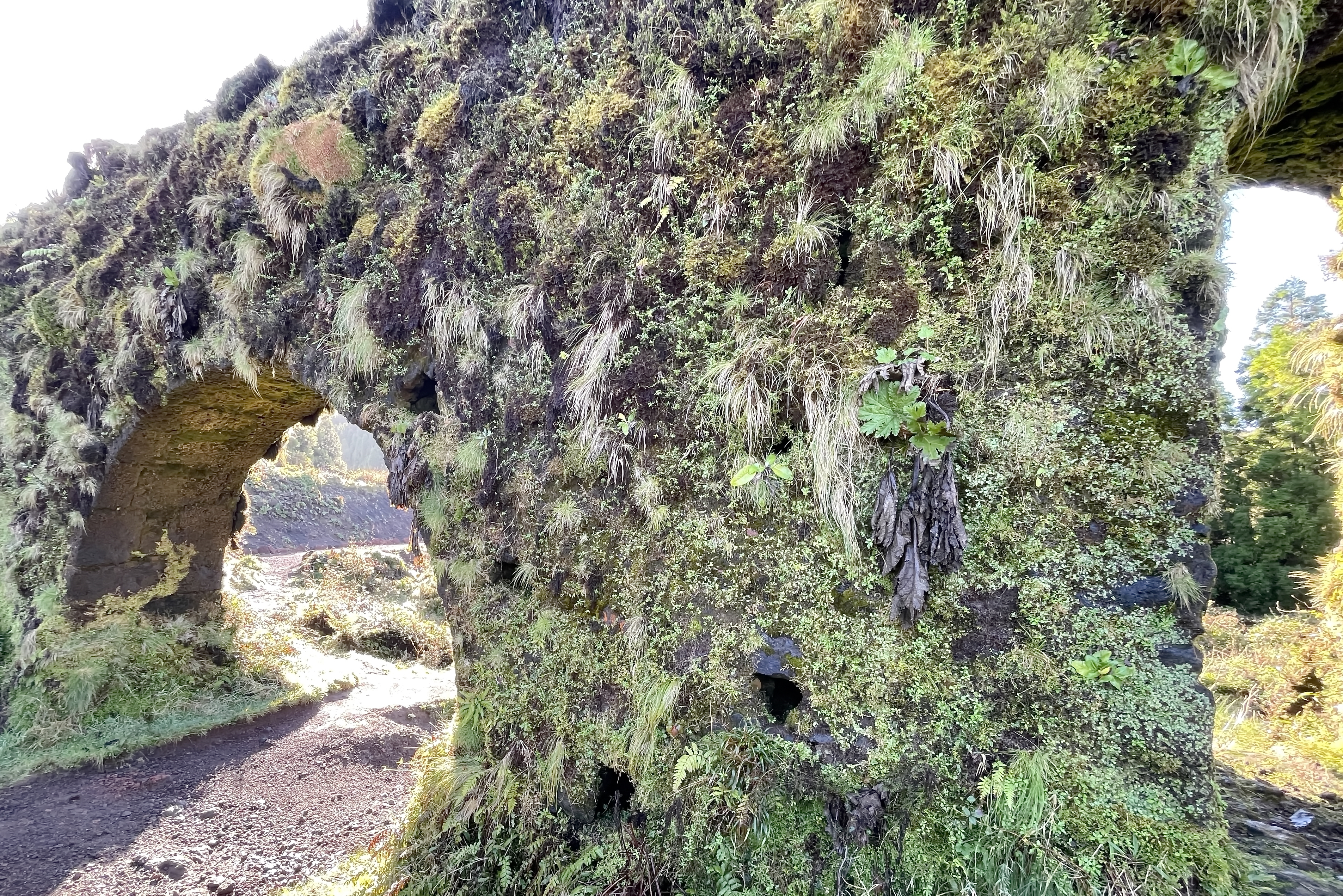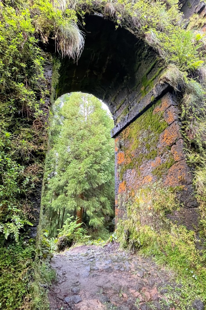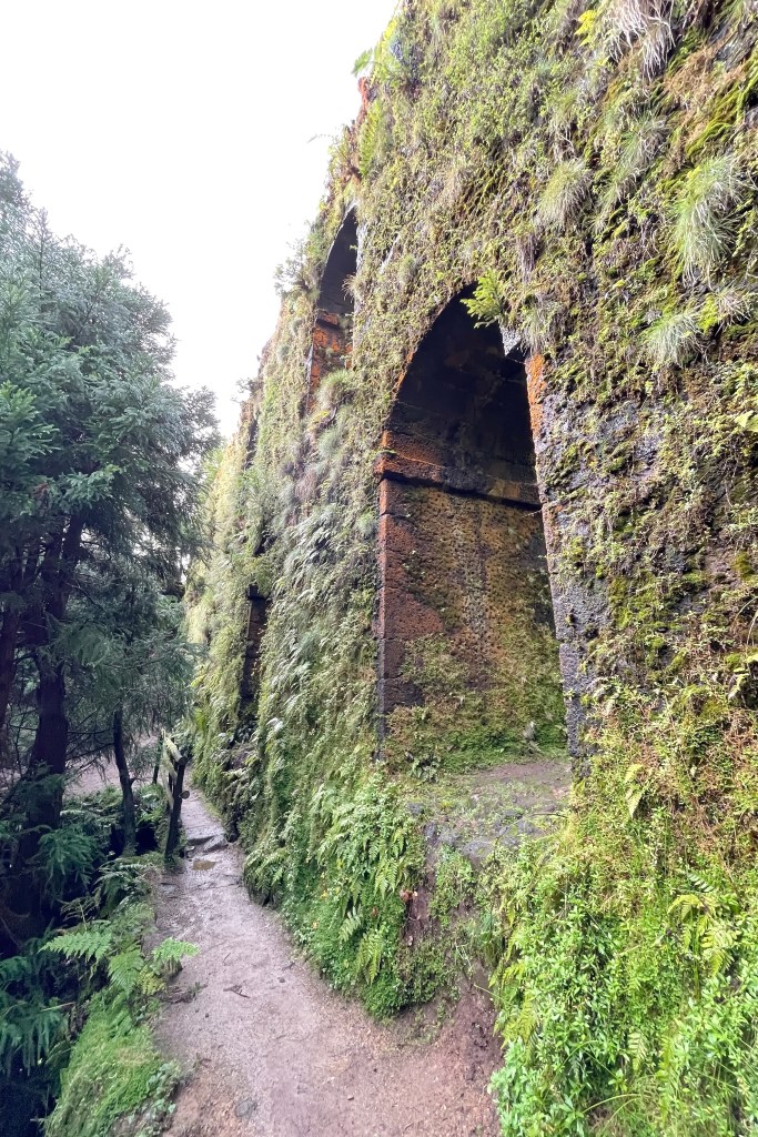 We visited on a cool, mist-soft morning, the kind where the clouds seem to hover just above the treetops and the world feels gently hushed. There was something unexpectedly graceful about the Muro das Nove Janelas. It isn’t a dramatic or much-visited destination; instead, it’s quiet and reflective, the sort of place that settles into you without trying. We lingered longer than planned, watching how the light shifted through each archway and how every “window” framed a slightly different piece of green horizon. What we loved most was how accessible it all felt—the small path inviting us to wander beneath the arches and along the old channel, our fingers tracing the rough volcanic stone and the soft moss that clung to it like velvet.