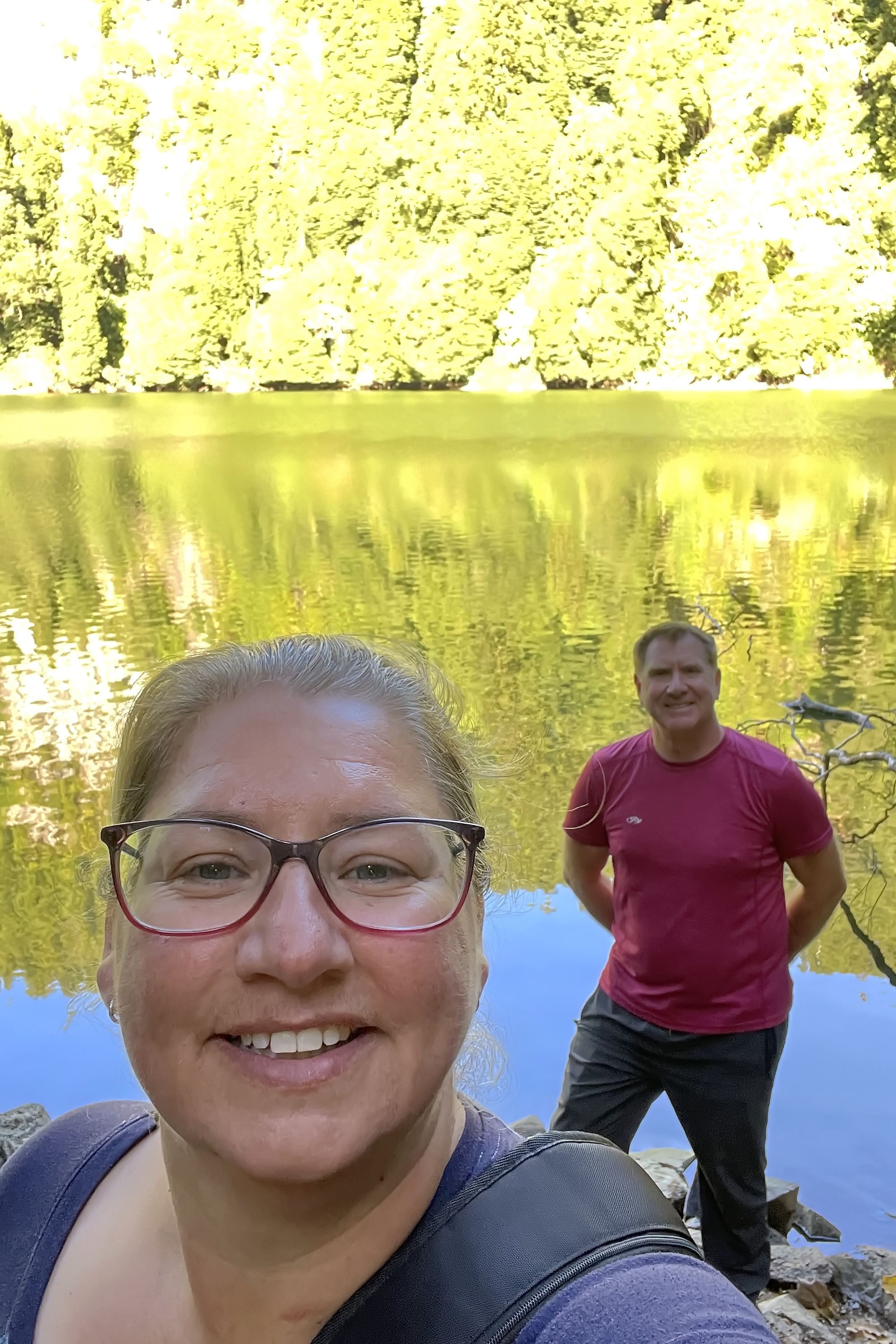 The shaded path dipped downhill through dense forest, and almost immediately the air changed. It grew cooler and damper, scented with wet earth and leaves. Sunlight filtered through the canopy in scattered beams, catching on moss-covered trunks and tangles of ivy. At times the trail narrowed and twisted down worn wooden steps, and we kept expecting the lake to appear around the next bend. It stayed hidden, teasing us, until suddenly it was there.
