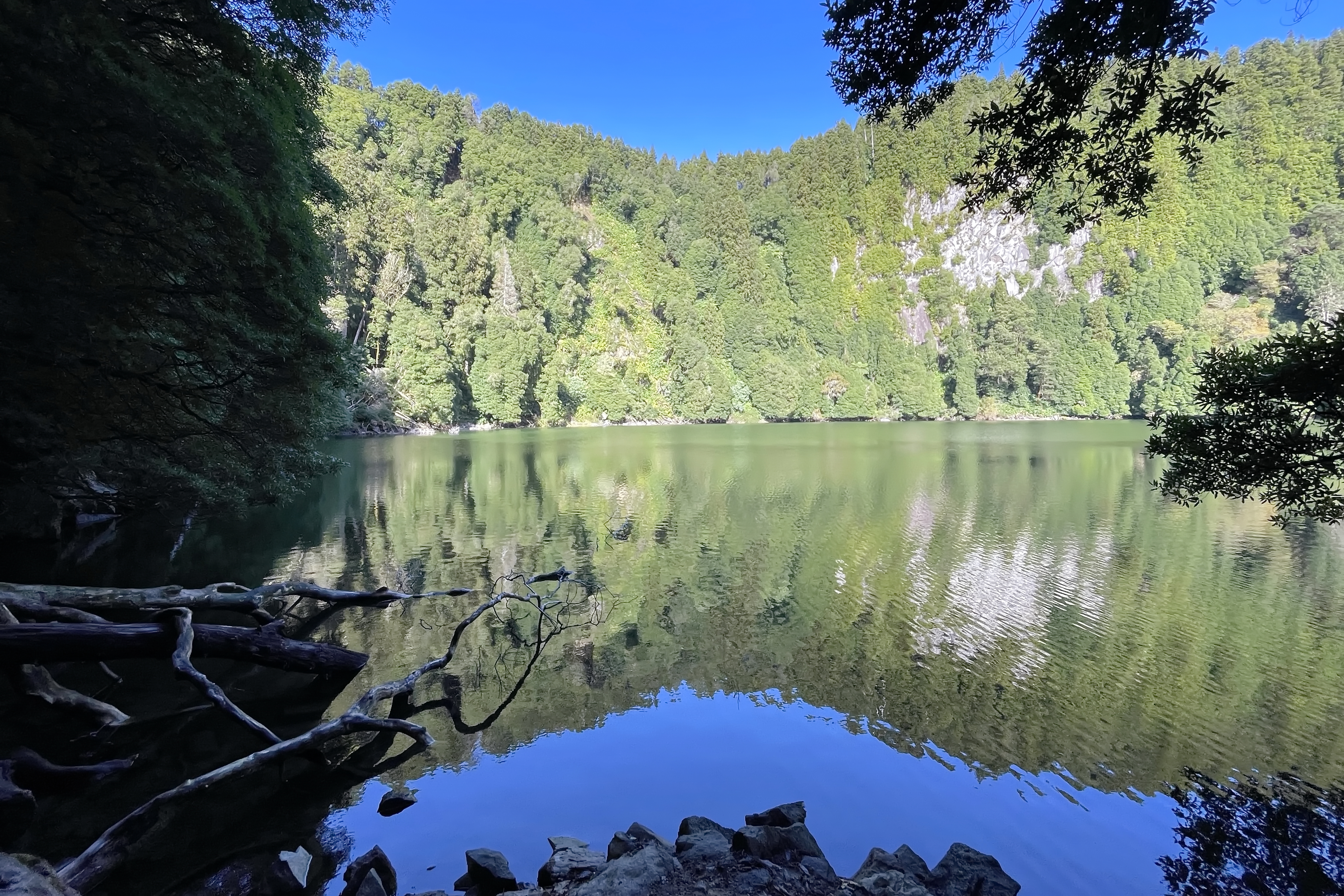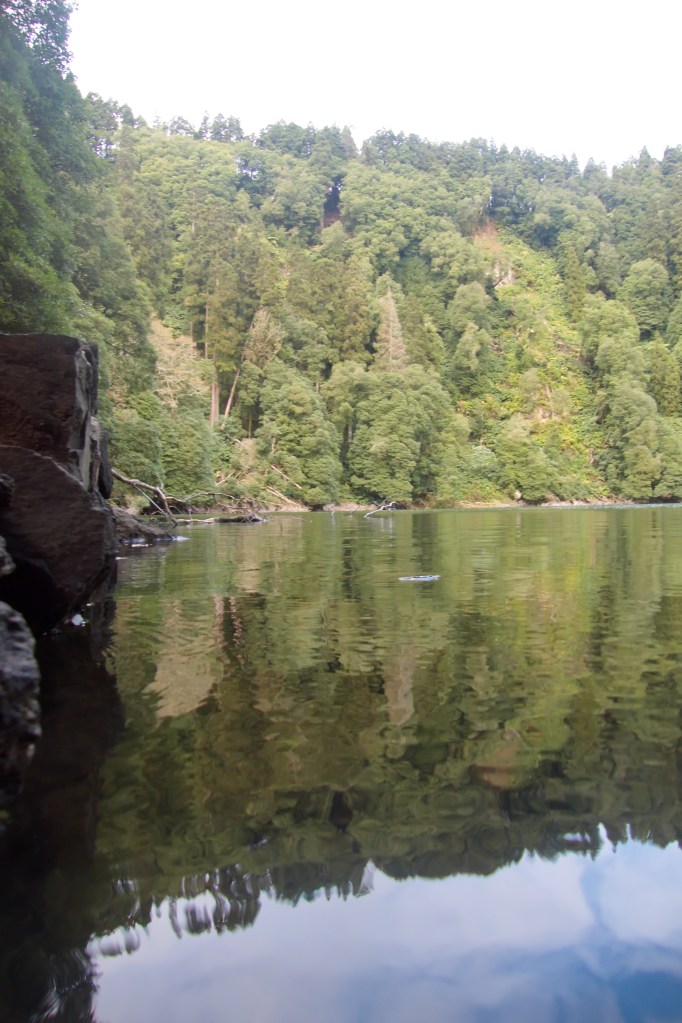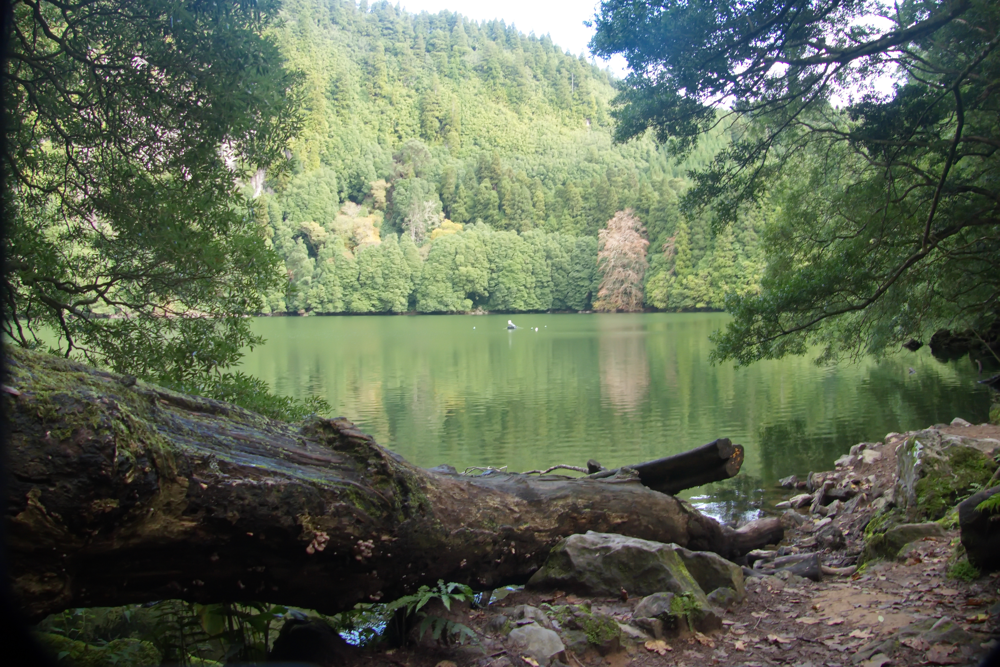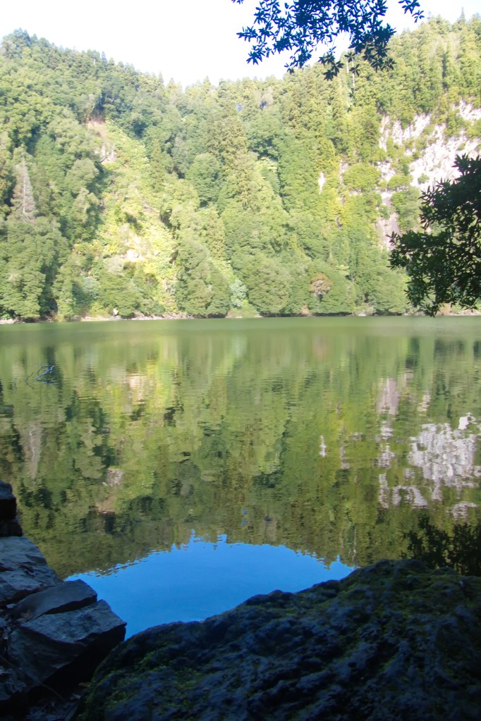 Lago do Congro lay perfectly still, a dark mirror framed by steep crater walls. The water was a deep emerald, almost mysterious in its intensity, and the vegetation crowded right to the edge as if trying to keep the place enclosed. We found a small opening near the shore and sat for a while, happy to say nothing at all. Occasionally a fish broke the surface, sending gentle ripples across the lake, but otherwise the world felt suspended. It was easy to imagine how little this scene must have changed—decades, even centuries passing with nothing more than the slow growth of trees to mark the time.