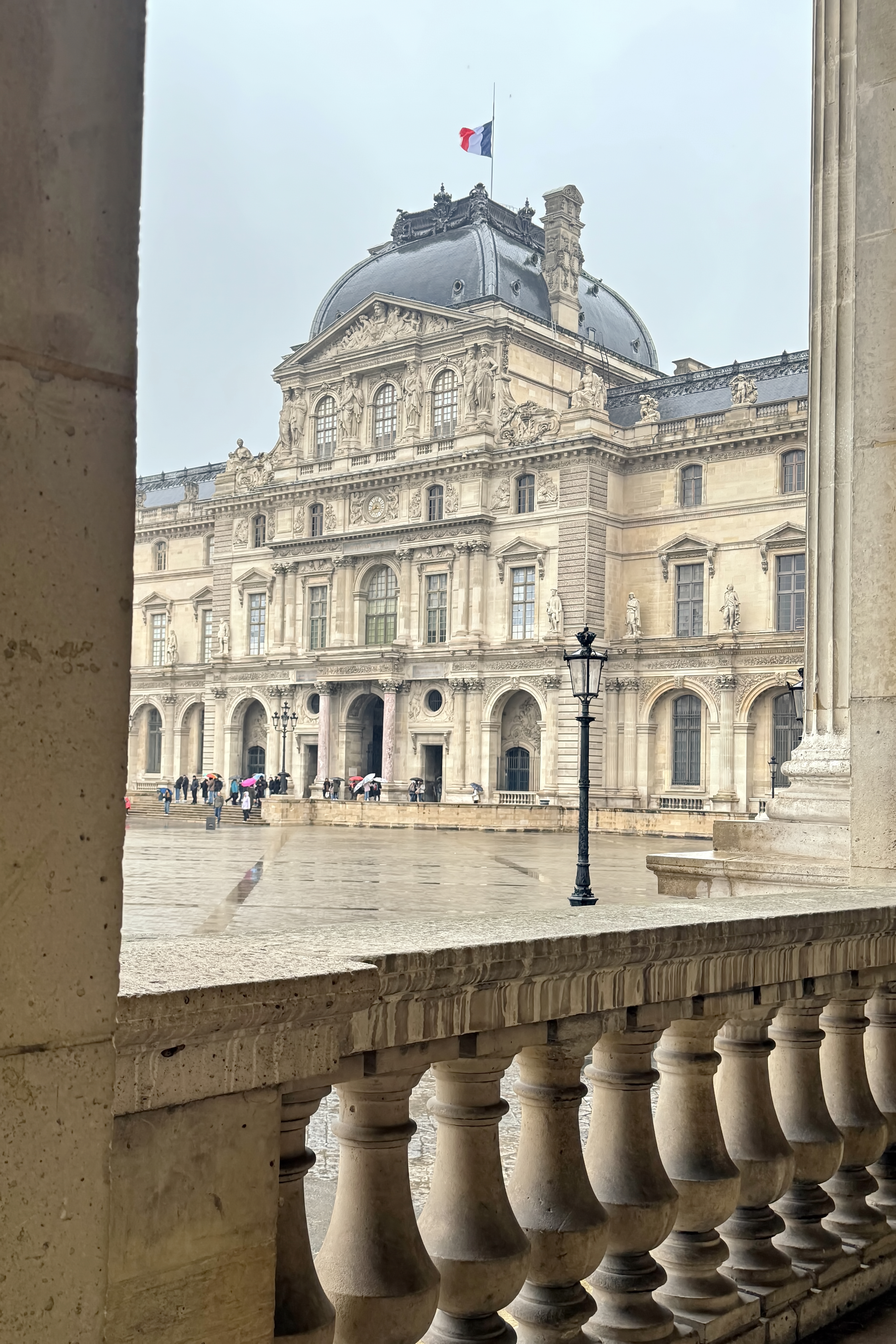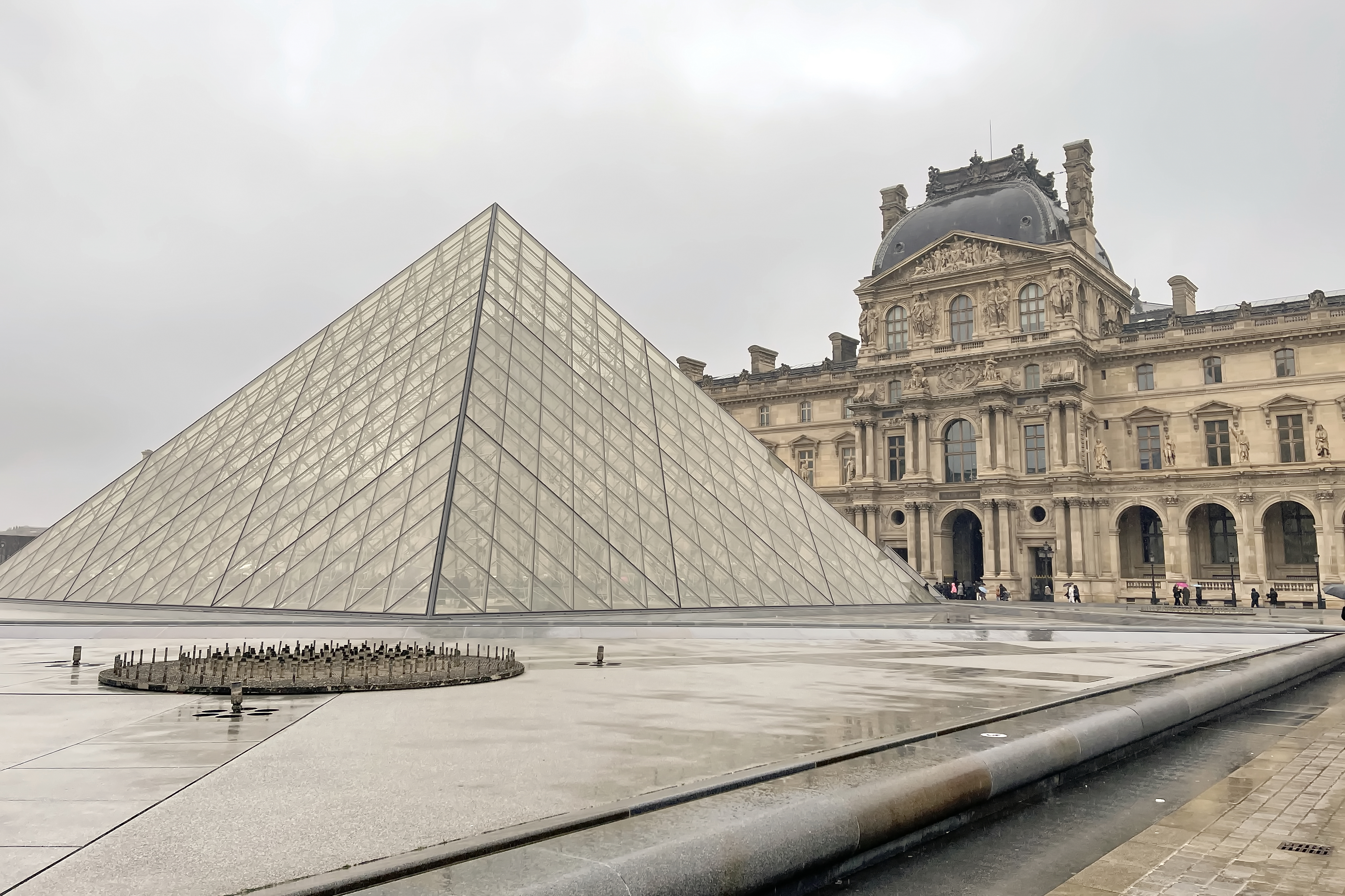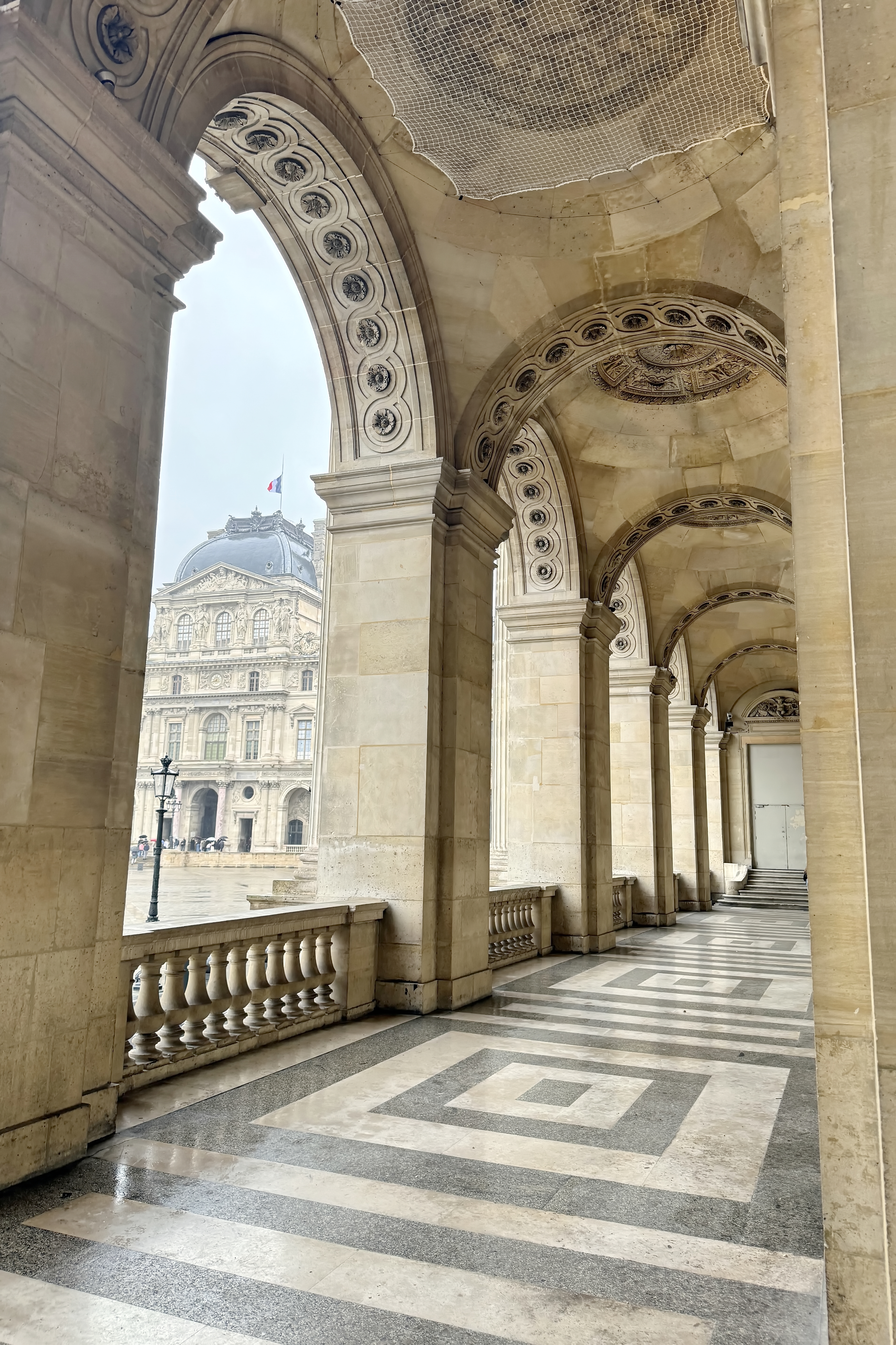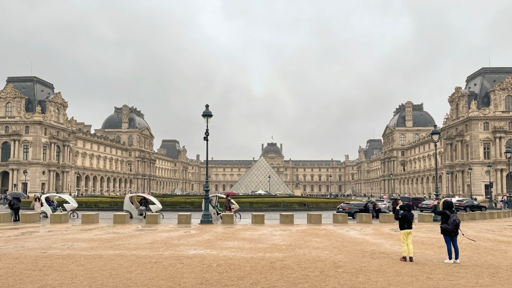 When we emerged again, the city had settled into a steady drizzle. We continued on to the Place de la Concorde, where the golden tip of the Luxor Obelisk shimmered bravely against the brooding sky. Ahead, framed perfectly through the Arc de Triomphe du Carrousel—Napoleon’s lesser-known tribute to victory—stood the vast and imposing Louvre Museum. Even in the rain, the courtyard buzzed with anticipation. Lines of visitors curled around the glass pyramid, umbrellas bobbing as people waited patiently for their chance to step inside—many, no doubt, with a quiet determination to glimpse the Mona Lisa in person. We paused for a moment, watching the scene unfold, feeling that familiar pull to join the queue. But with the rain settling in and the crowds thickening, we chose differently. Instead of squeezing in shoulder to shoulder with fellow sightseers, we wandered the perimeter of the grand façades, admiring the scale and symmetry, before turning back toward the dry, cozy comfort of our apartment.