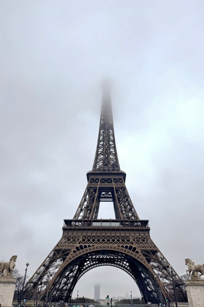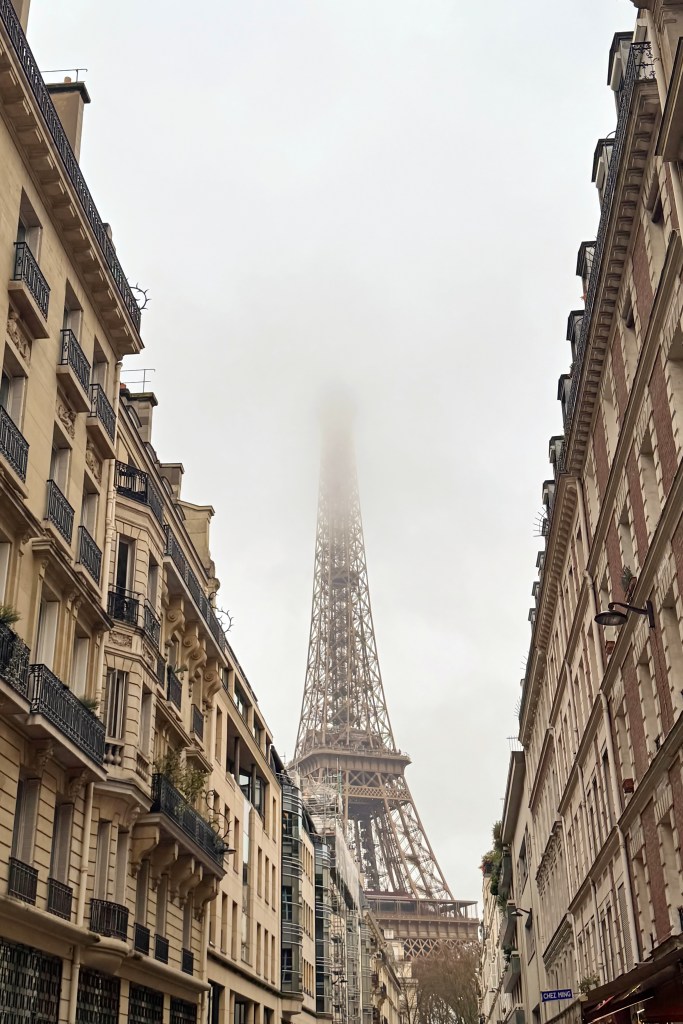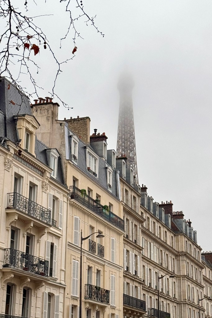 We began at the Trocadero, where the view of the Eiffel Tower across the Seine felt entirely different from the sparkling spectacle of the night before. This time, the Tower stood quiet and subdued, its top disappearing into low clouds as though it hadn’t quite woken up yet. Crossing the river, we slowed our pace, letting ourselves meander along elegant, tree-lined avenues. The classic Parisian buildings—all wrought-iron balconies and creamy stone façades—framed teasing glimpses of the Tower as it appeared and vanished between them.