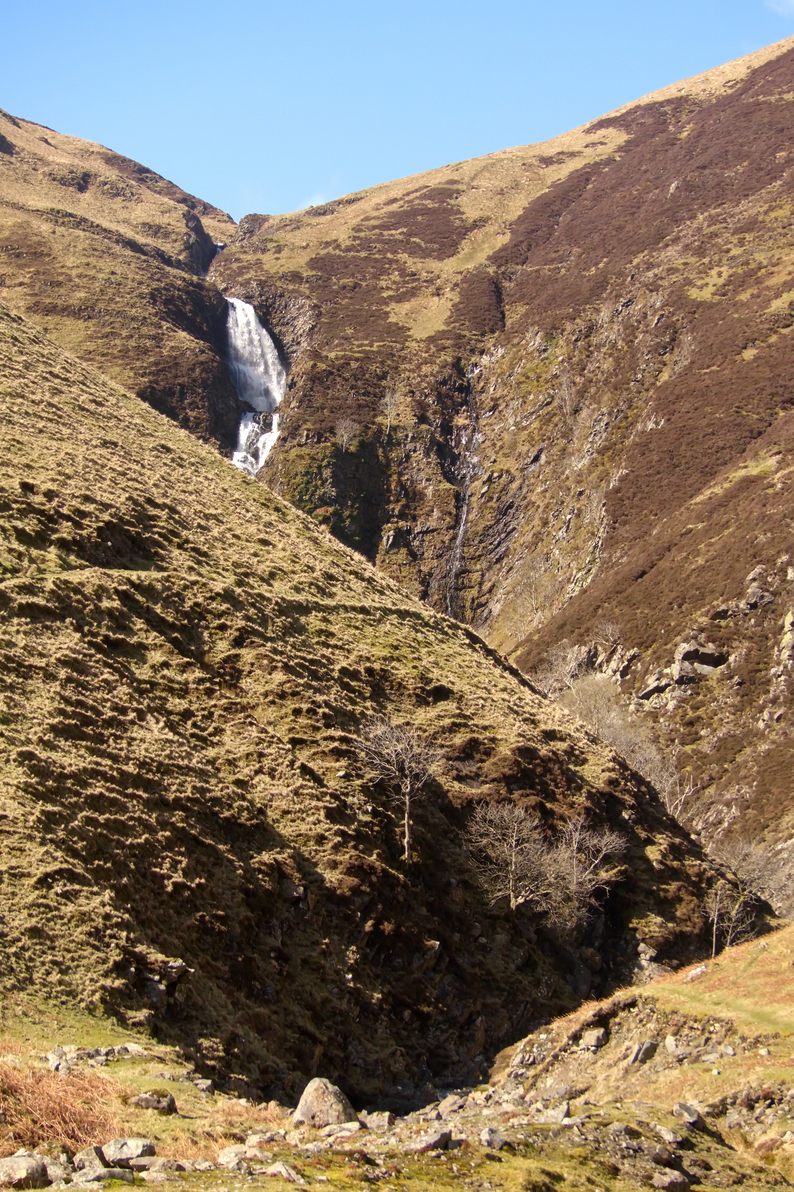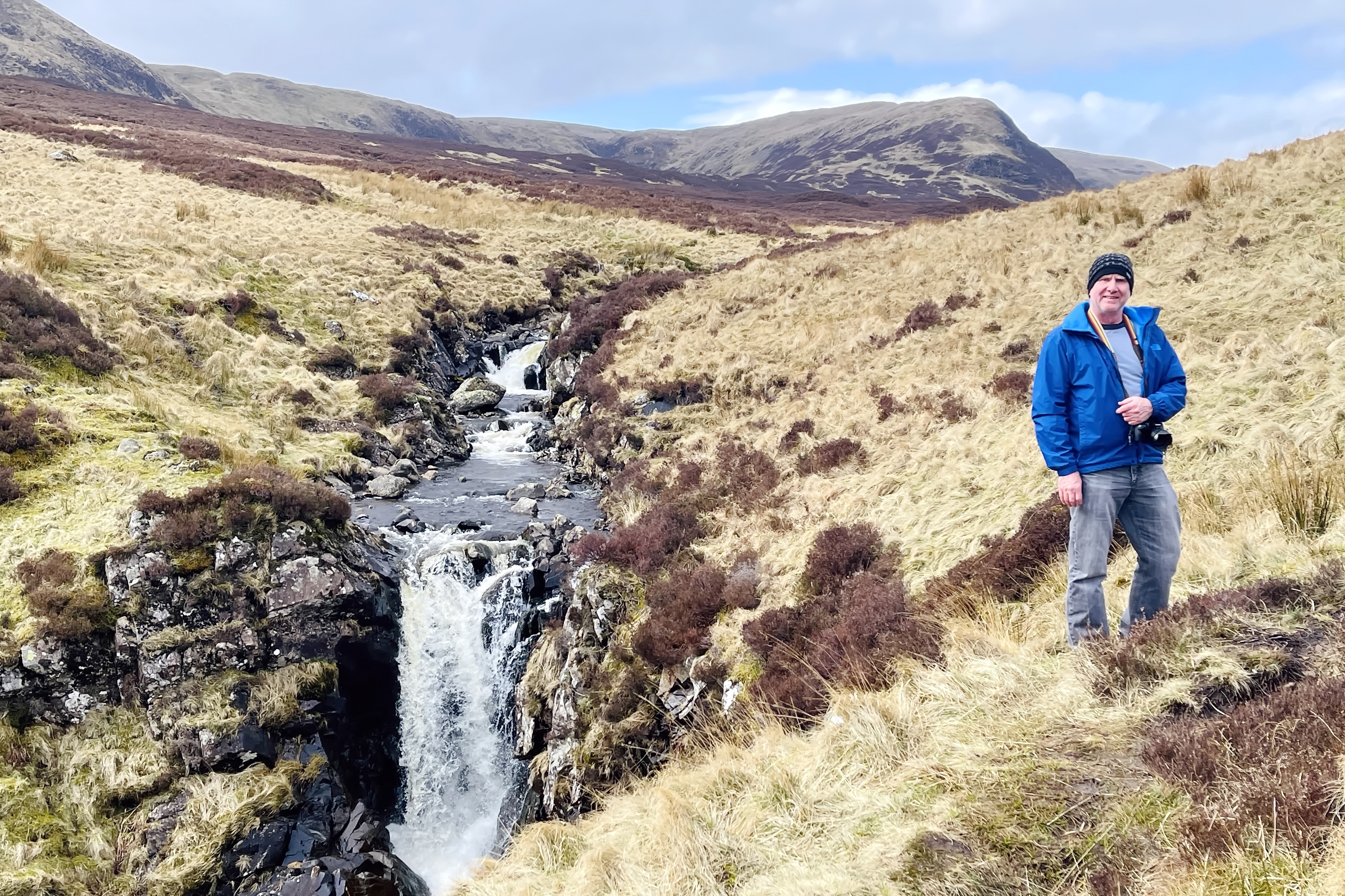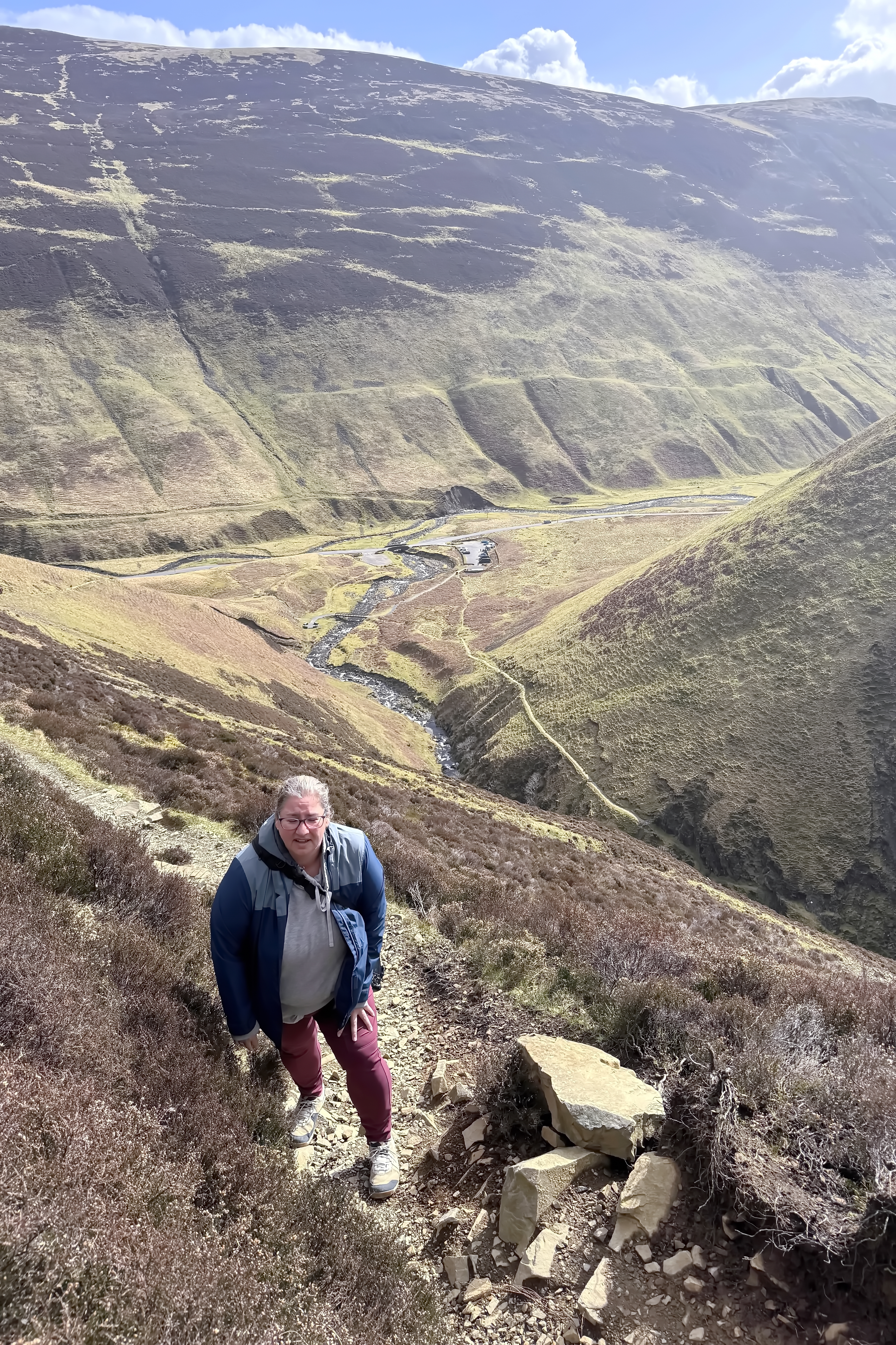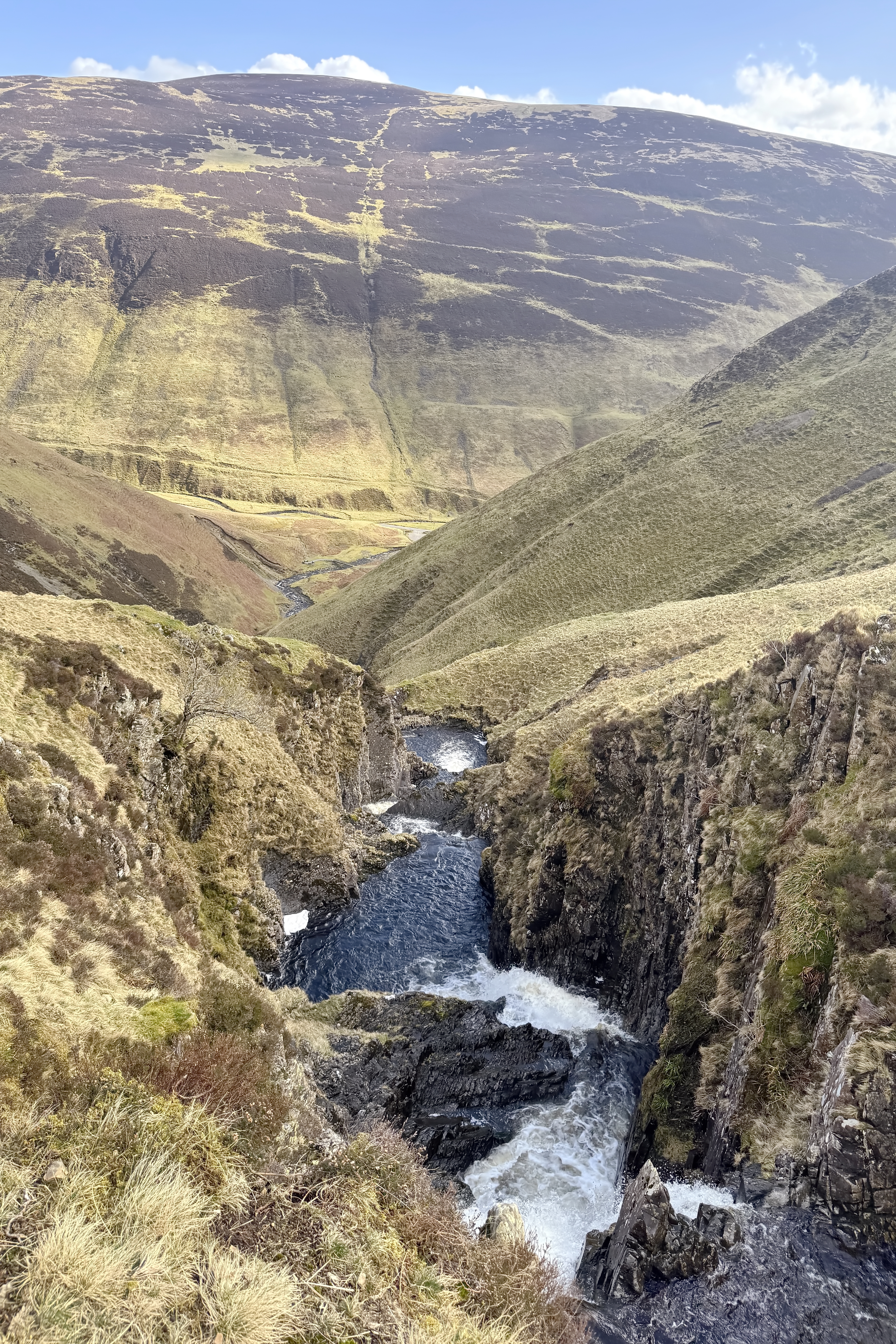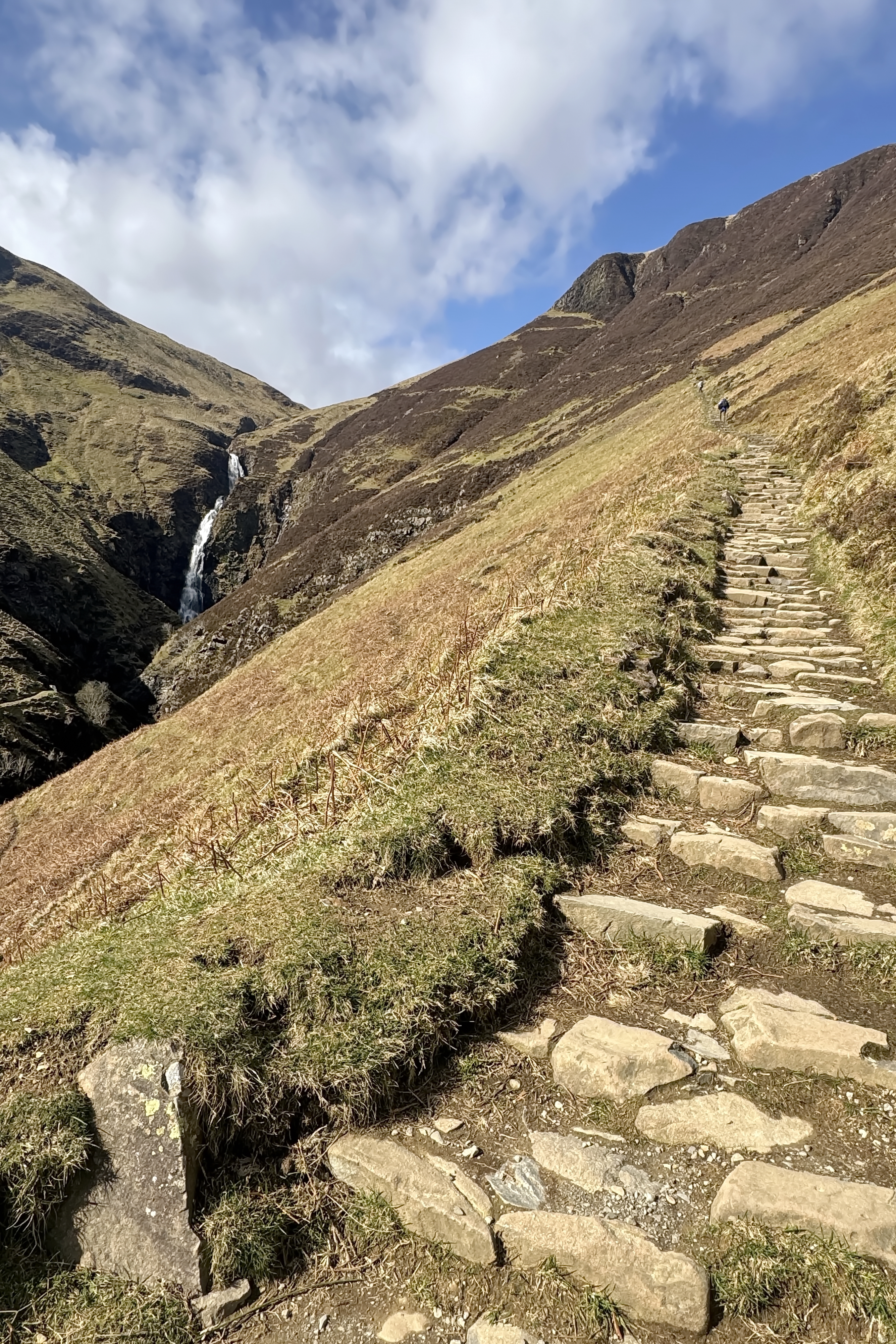 We set off under a brilliant blue sky, the kind that makes everything feel sharper and more alive. The sun lit up the falls and surrounding hills in that way only Scotland seems to manage—deep greens, shifting shadows, and air so crisp it almost feels new in your lungs. The path climbed steadily upward, stone steps guiding us along the edge of the valley. Every time we turned around, the view opened up just a little more—the waterfall stretching out below us, the valley widening, the scale of it all slowly revealing itself.