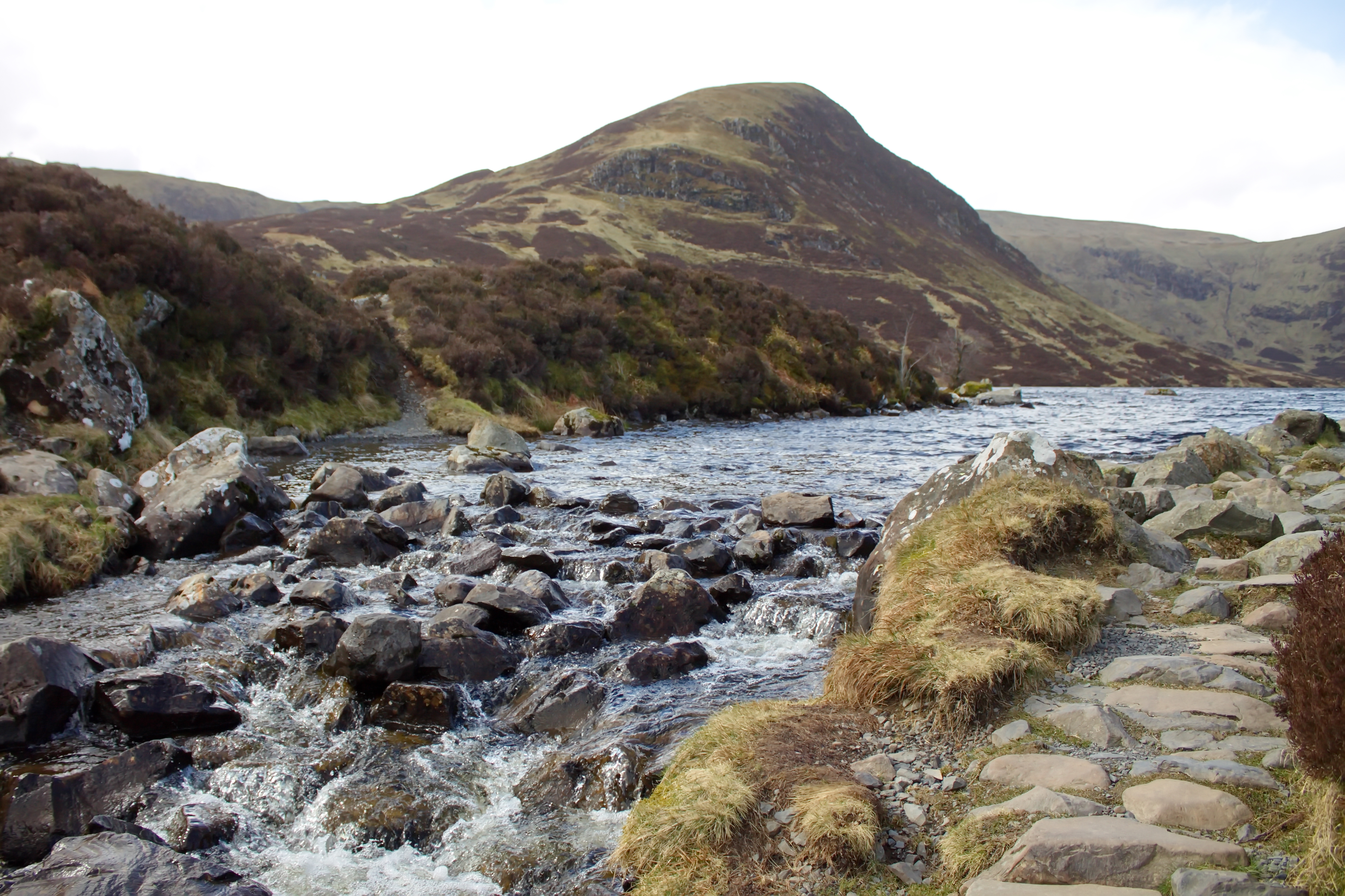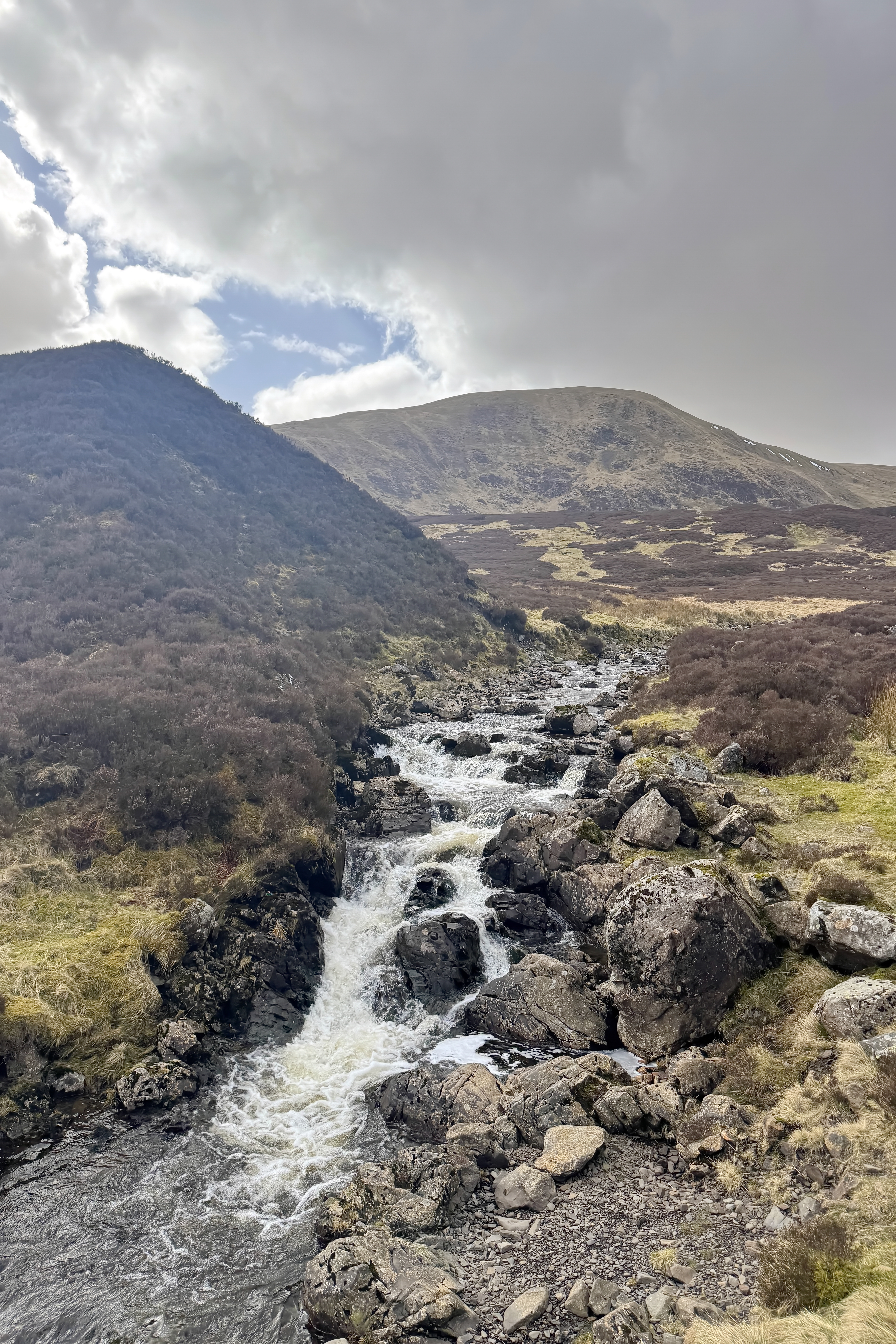 Eventually, after what felt like a never-ending upward push, the trail softened as we crested into the upper valley. The landscape changed almost instantly. To our left, the broad presence of White Coomb rose across the moorland, while the trail ahead became gentler, quieter. Small streams crossed our path, trickling down to join the Tail Burn, and the ground shifted underfoot—soft in places, edged with the faded browns and russets of last year’s heather. Early spring hadn’t quite brought the colour back yet, but you could feel it coming. Even the sheep, scattered across the hillside, seemed part of that quiet transition.