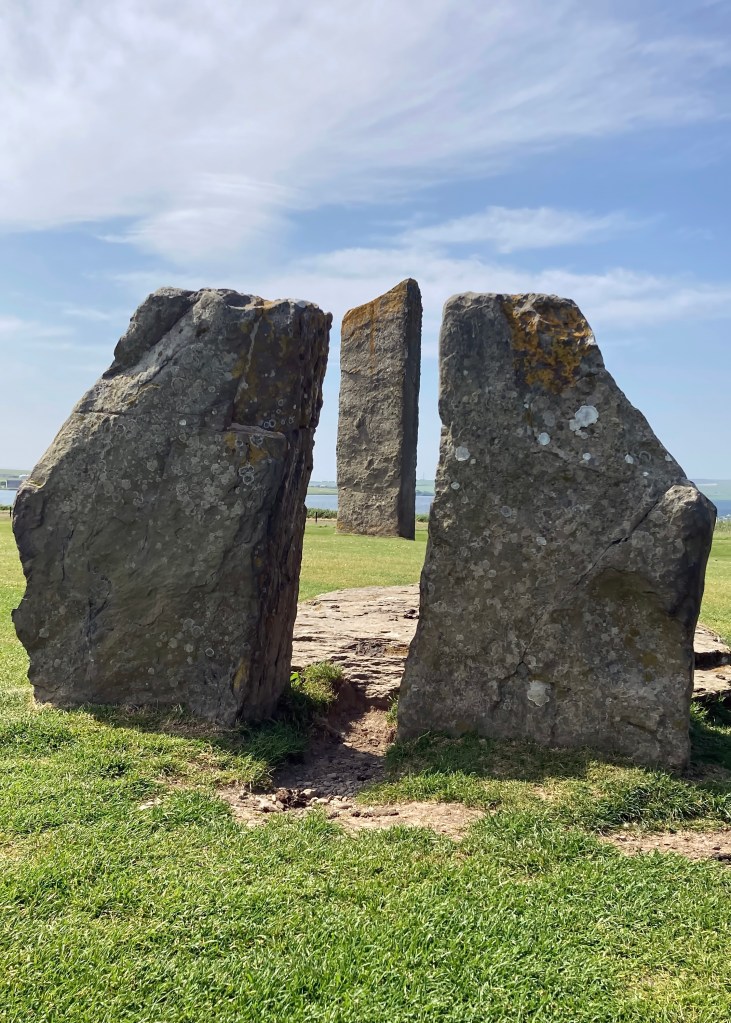 A little farther along the road, the Stones of Stenness rise up, fewer in number, but taller, sharper, somehow more confrontational. Just off to the side, we followed a quiet track into the old village of Stenness, a simple cluster of stone houses from a much later time, but still full of stories. It’s easy to imagine voices there, smoke from chimneys, the rhythm of ordinary life unfolding next to these ancient ceremonial spaces. A long time ago, the past and the present were neighbours.