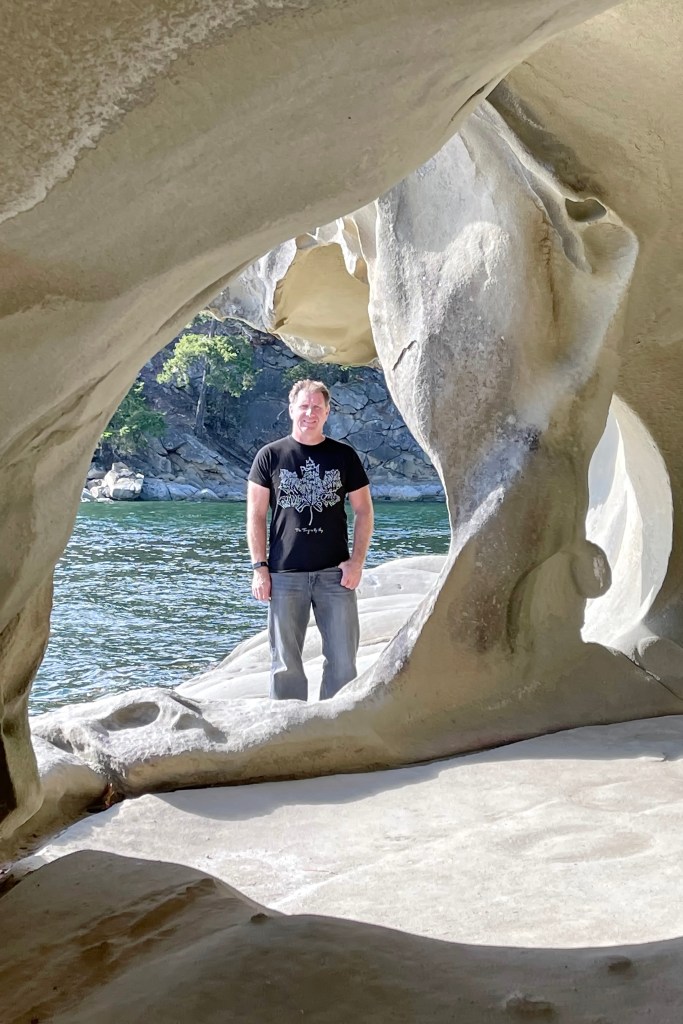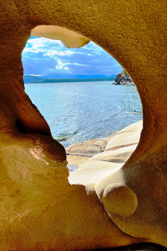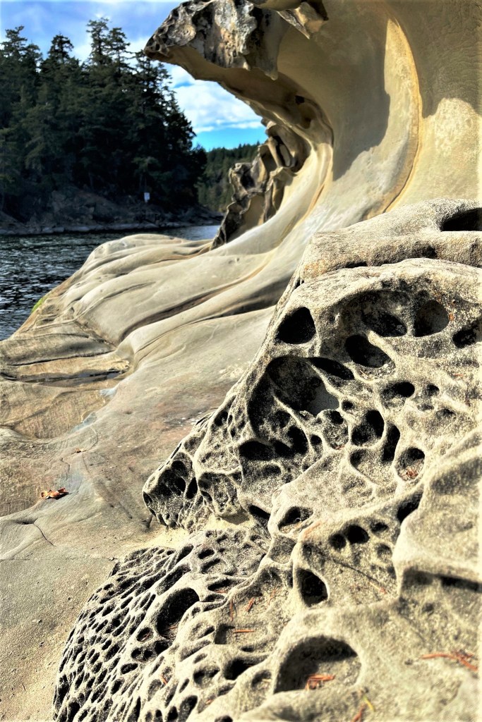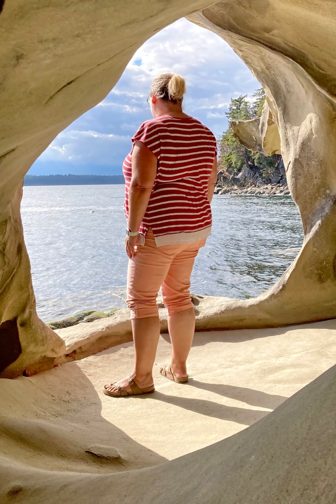 The final stop of our whirlwind island tour was to Galiano Island, known for its natural beauty, hiking, and beach access. Our most notable experience was the dramatic sandstone caves at Retreat Cove. These are located along a dead-end road and a short unmarked path and there are no signposts or directions. We had seen pictures while researching the island and wanted to explore this hidden gem for ourselves. The caves are very picturesque with interesting, weather worn rock formations, especially in the afternoon sunlight and they provided neat views of the cove, and the channel out to Salt Spring Island.