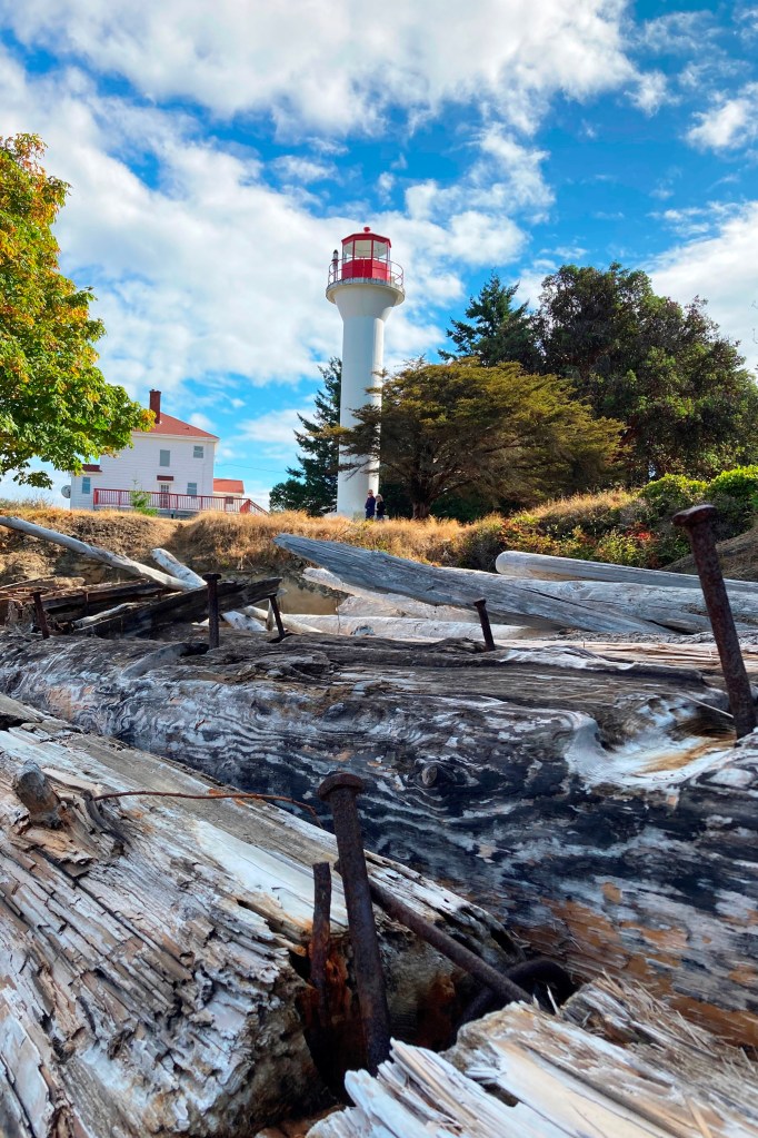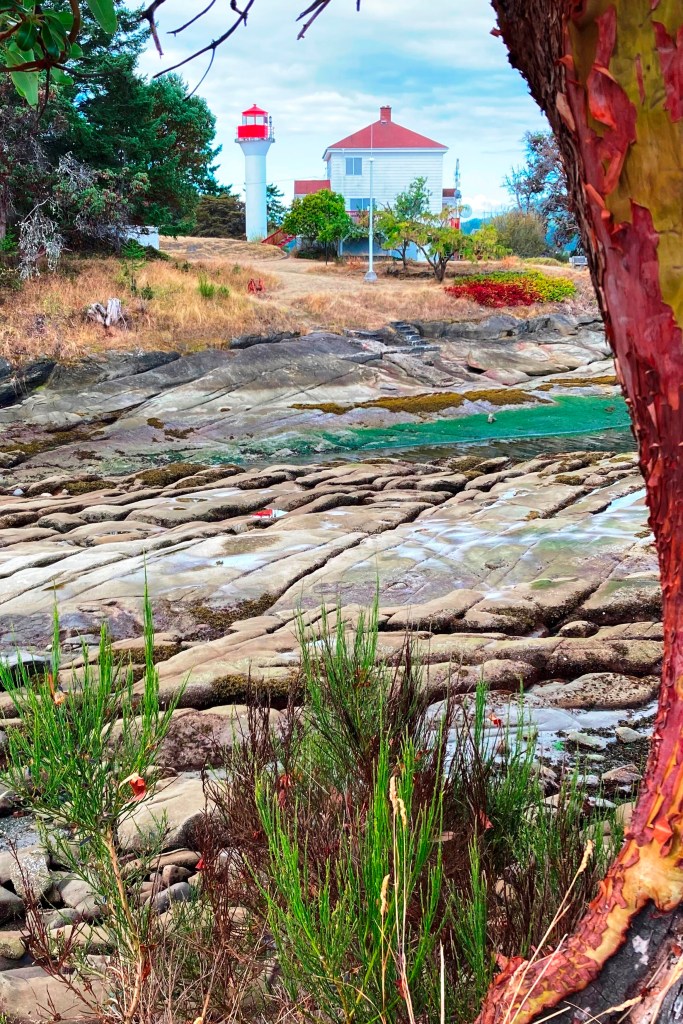 At Georgina Point on the northern tip of Mayne Island is Lighthouse Park, which contains Active Pass Lighthouse, at the entrance to a narrow channel between Mayne and Galiano Islands. Listed as a Heritage Lighthouse for its historical, architectural, and community values, we also loved the wide range of textures and vibrant colours in this area. Wandering around the park, we came across some old ship remains with rotten timbers and rusted iron nails, and got our first introduction to the native Arbutus trees, with their distinctive reddish-brown bark that peels in papery flakes and strips.