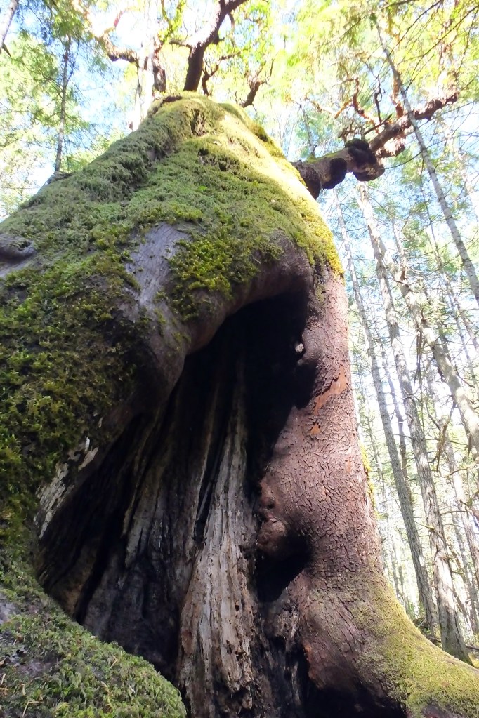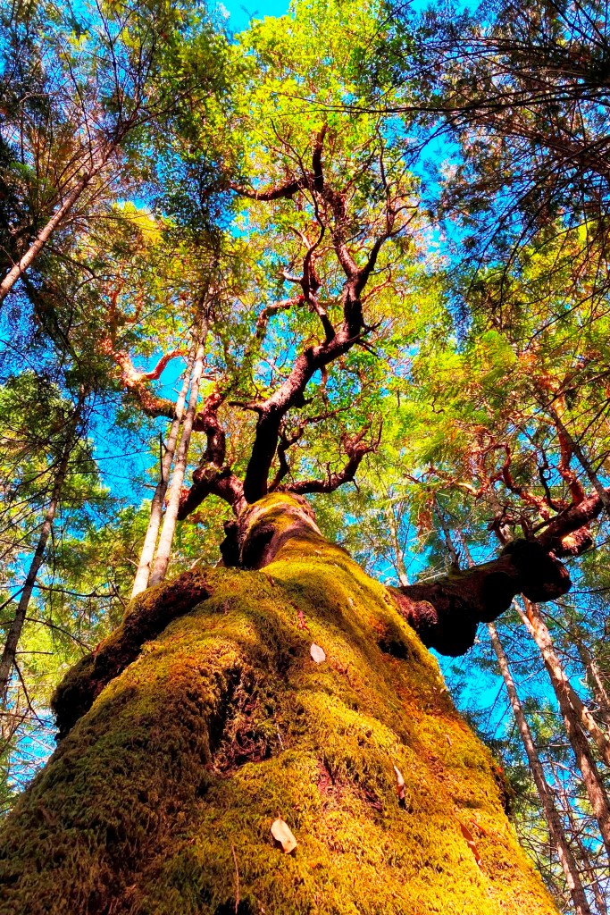 Mayne Island is known for its majestic arbutus trees, including some large, wind-twisted specimens. Arbutus, also known as Madrone, are native to the Pacific Northwest and are characterized by their distinctive bark and shape. The island’s arbutus trees are a significant part of its natural beauty and ecological landscape, playing a role in the intertidal zone, the forest, and the overall ecosystem. We had a pleasant woodland wander along the Old Gulch trail in Mount Parke Regional Park which winds through a forest of giant sword ferns, western red cedar and red alder, ultimately leading to the splendid and individually signposted ‘Giant Arbutus’ tree. In addition to it’s astounding size, the vividly bright colours really stood out in the afternoon sunshine.